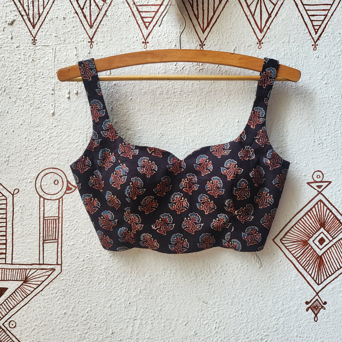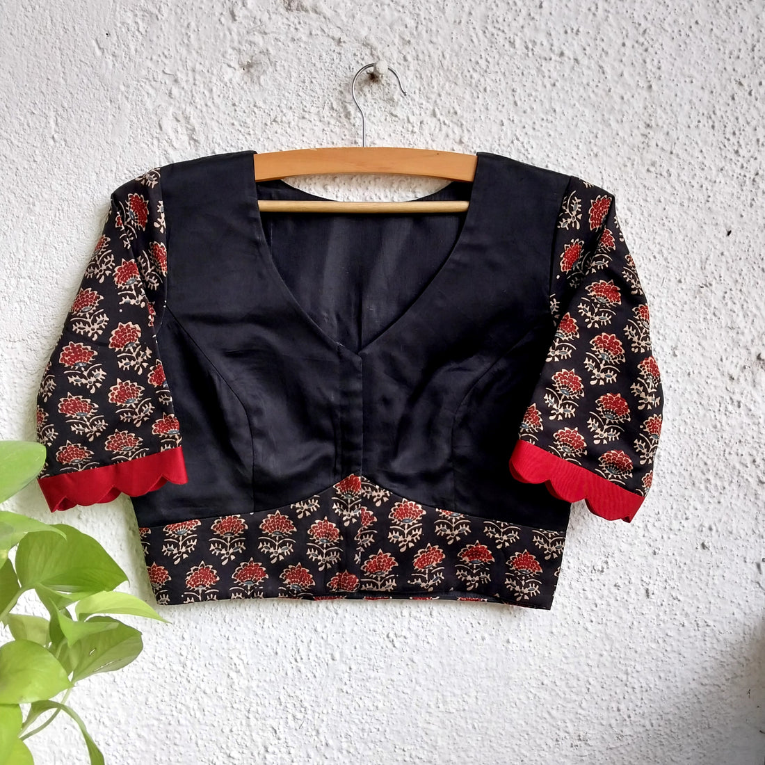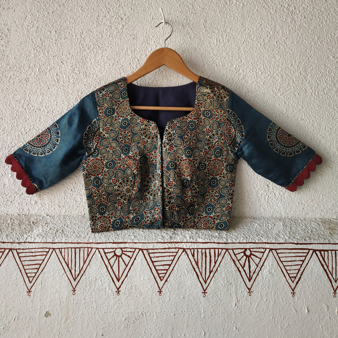 Ajrakh handblocked print pure modal fabric is used to make this blouse. Blouse has scallops...