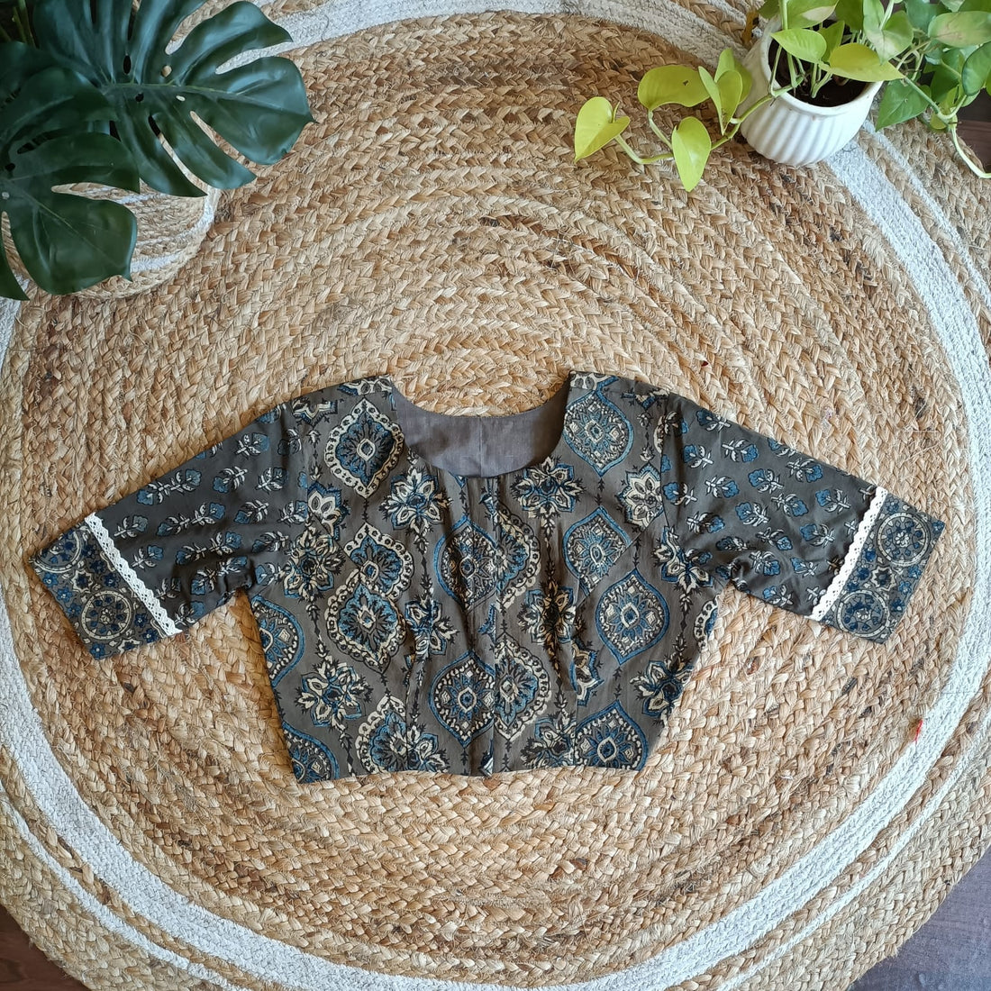 Perfectly tailored beautiful pure mashroo silk blouses which has ajrakh handblocked print done on it....