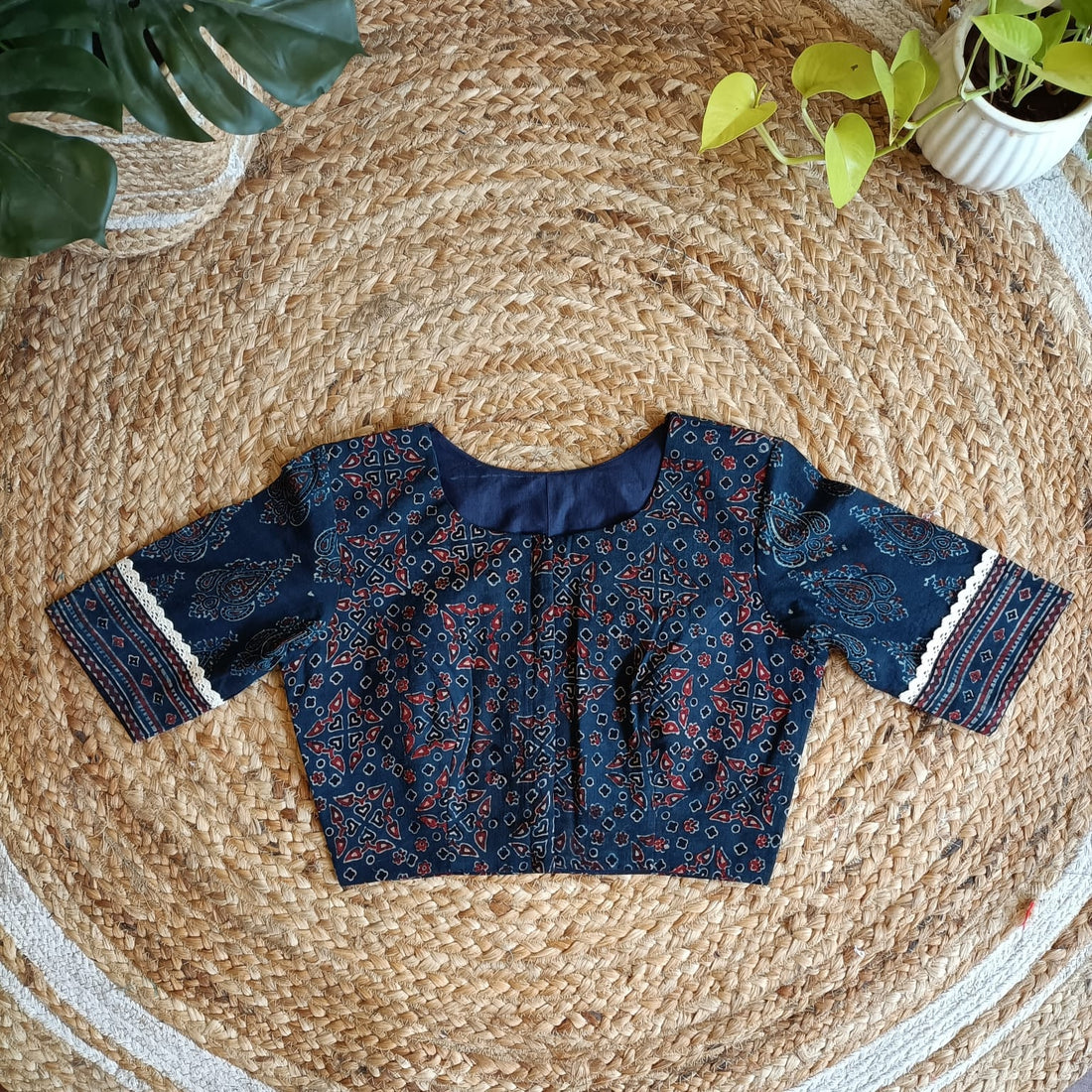 Cotton ajrakh blouse stitched with lining and pads. Opening is given on back side with...