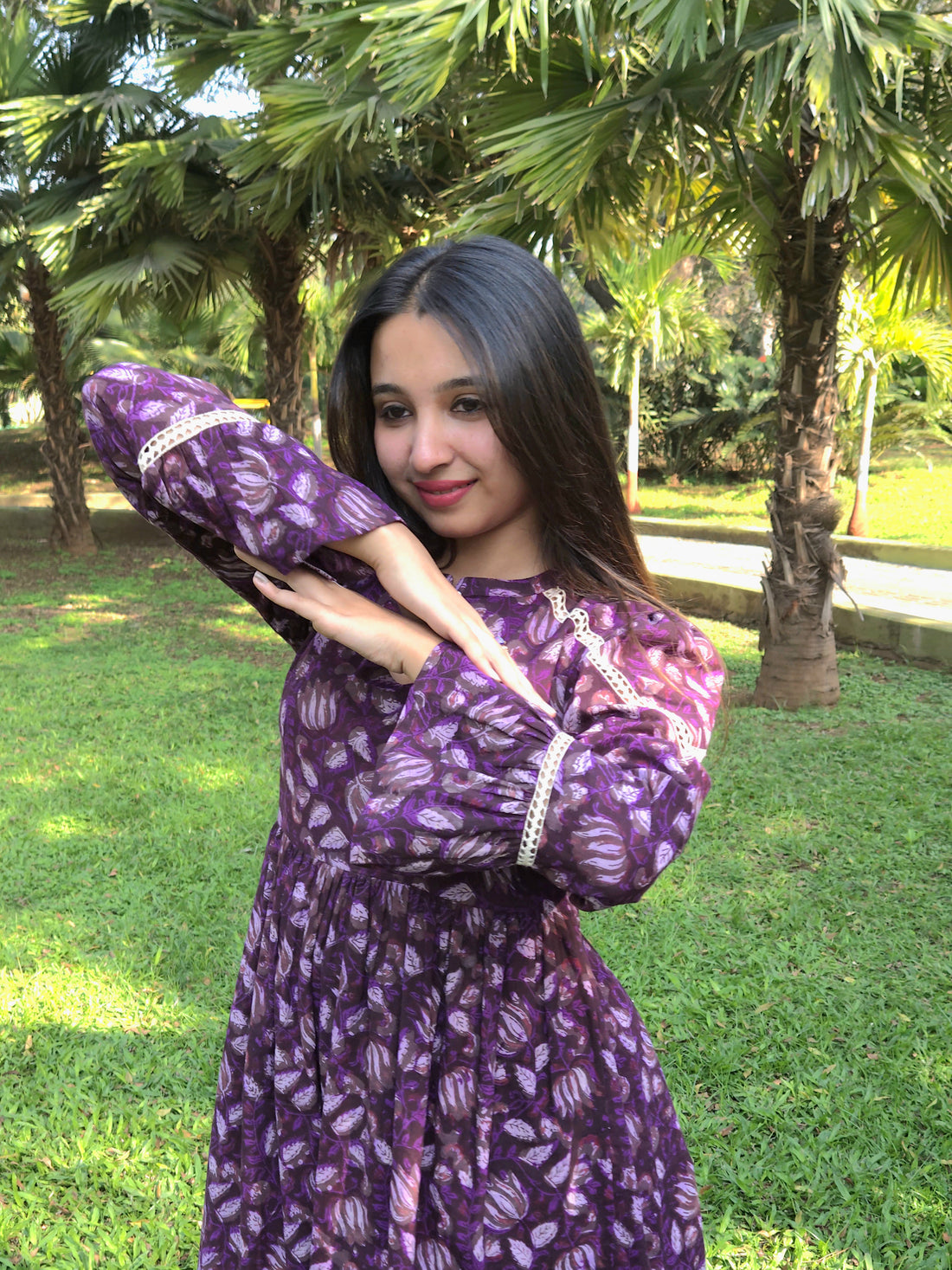 Block Printed Flared Dress-Purple