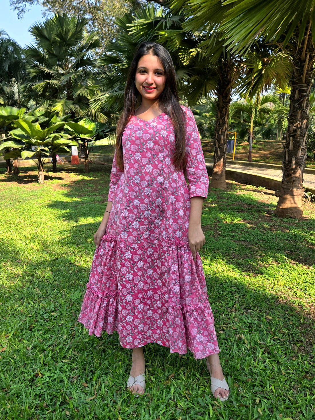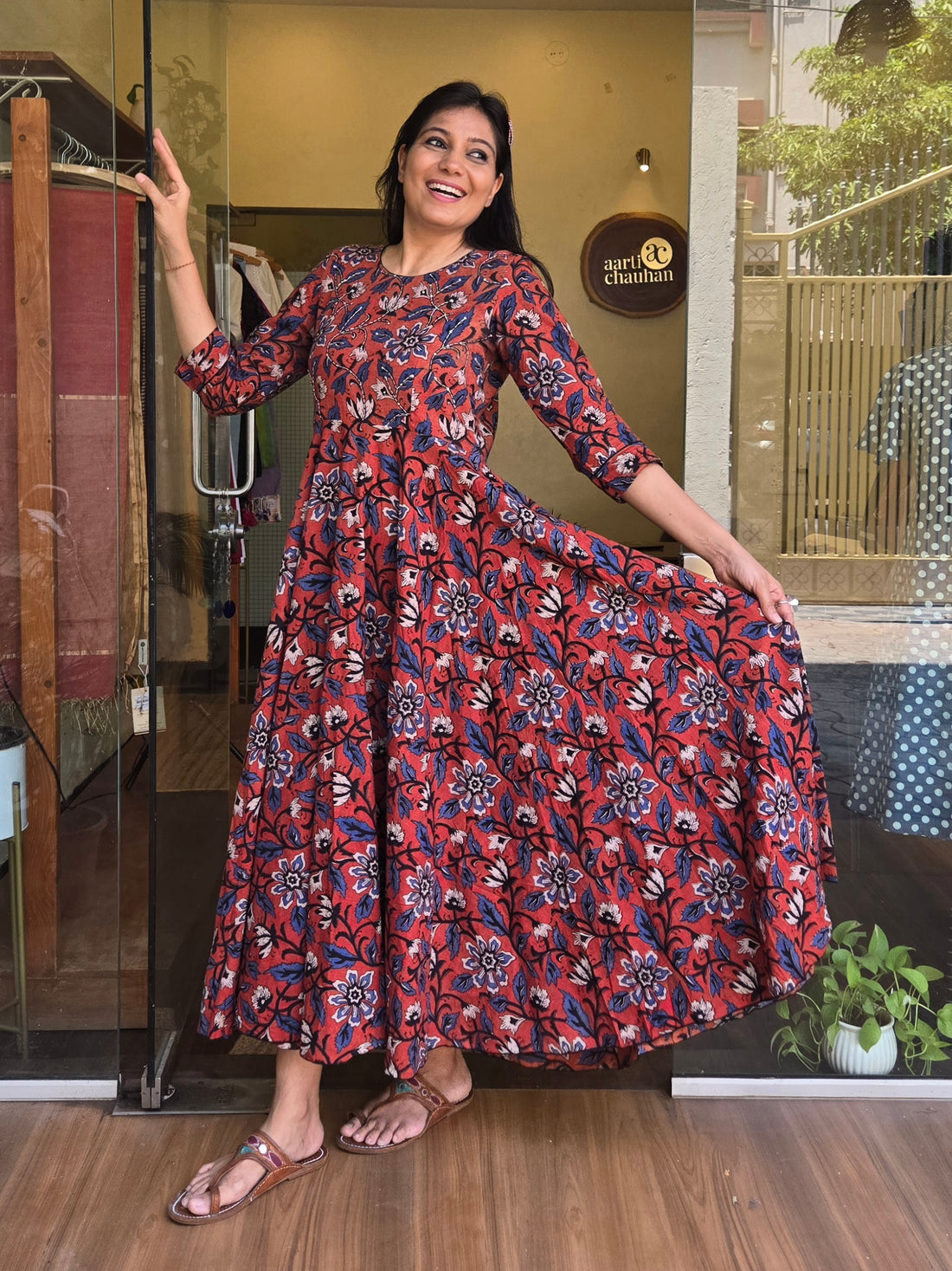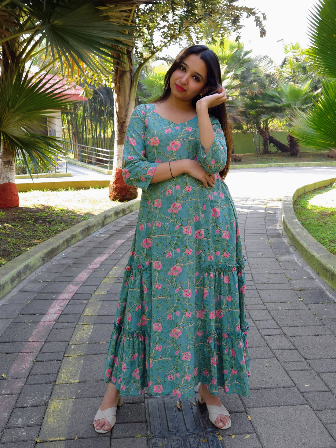 Elevate your wardrobe with our handcrafted block-printed fit-and-flare long dresses. Designed with precision and adorned...