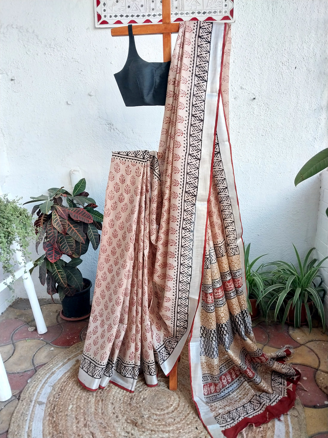 Cotton linen hand blocked printed saree with silver border and pallu. Natural dyes are used to...