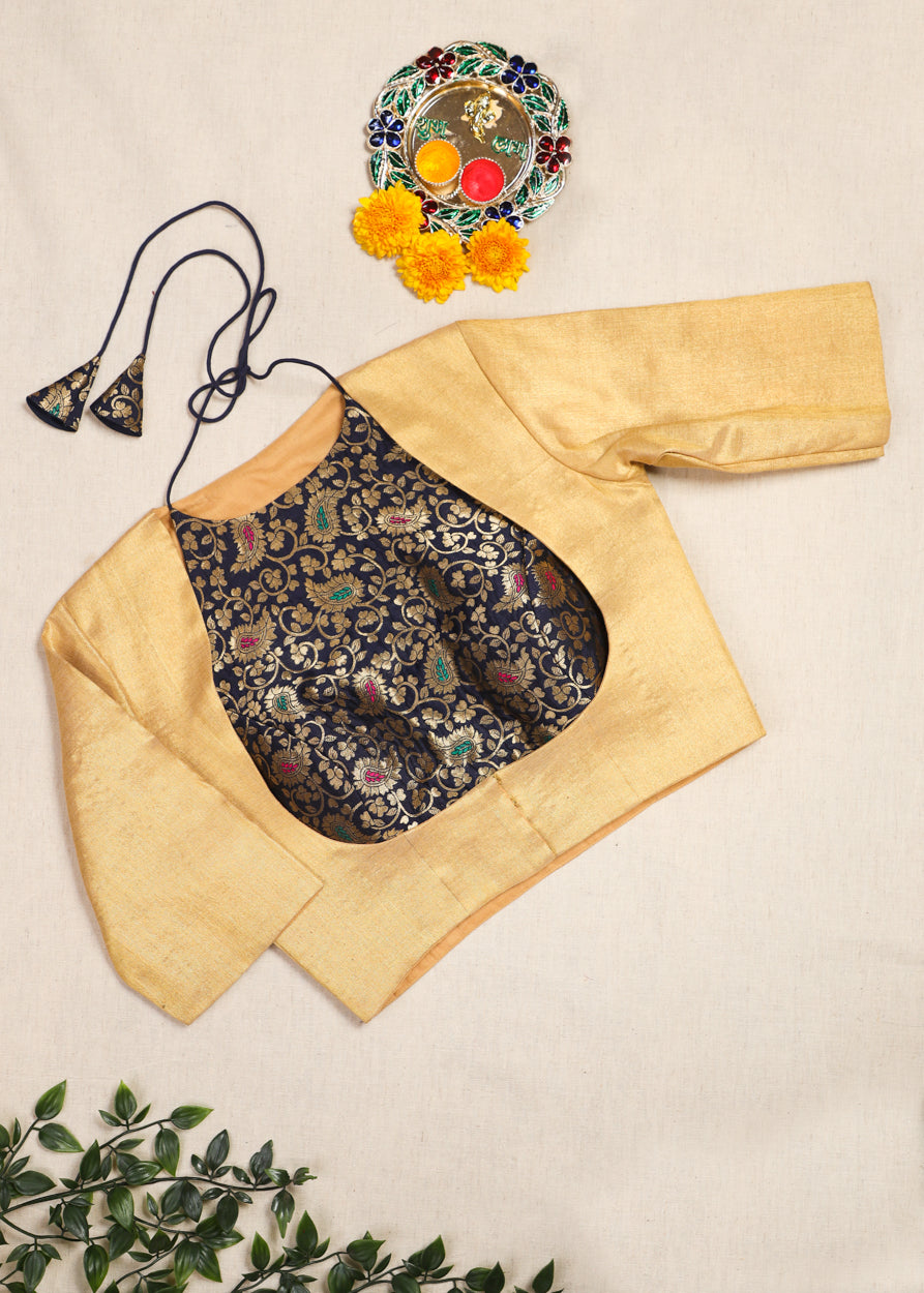 Embrace timeless craftsmanship with a modern twist in this royal blue and golden two-piece blouse....