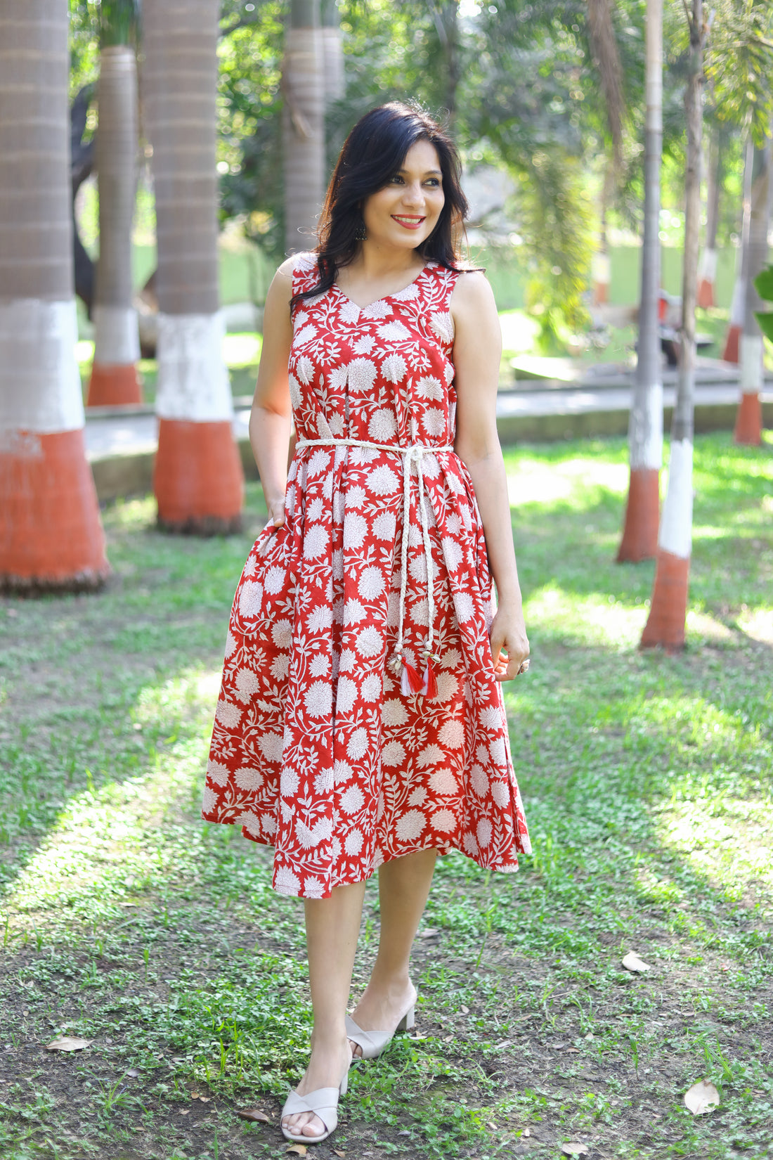 This dress is a casual, everyday piece with a vibrant red and white floral print....
