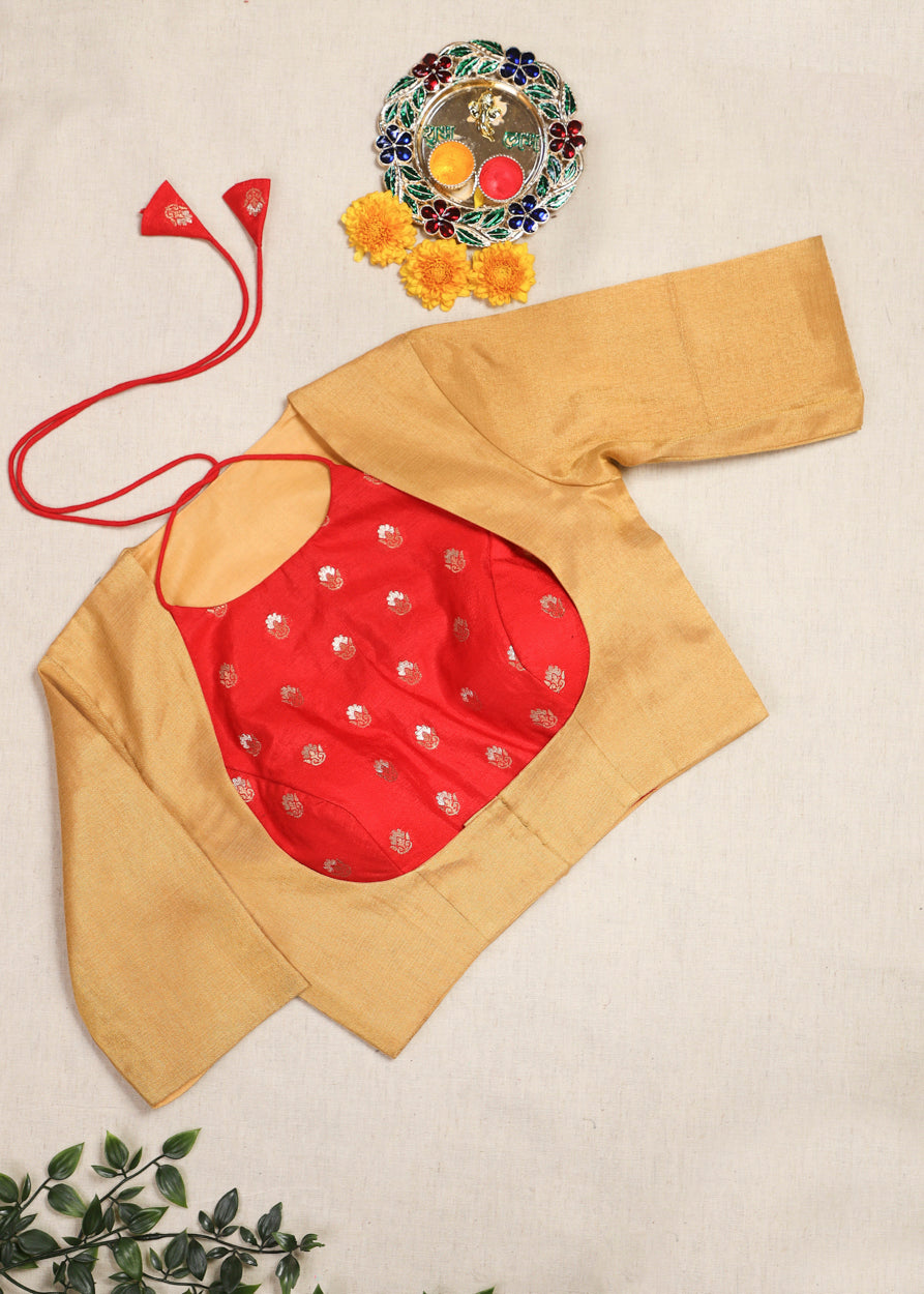 Embrace timeless craftsmanship with a modern twist in this bold red and golden two-piece blouse....