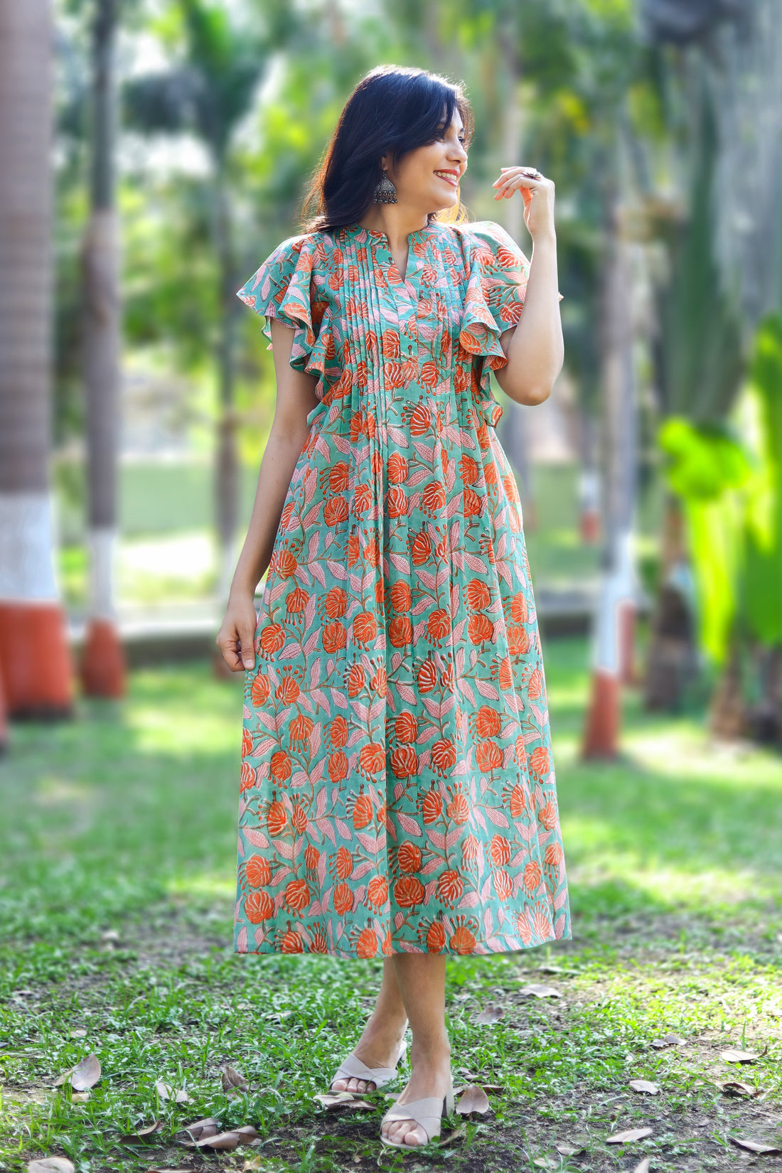 Tie-dye pink and yellow dress has a comfy fit flare silhouette.Handcrafted tie-dye technique is used...