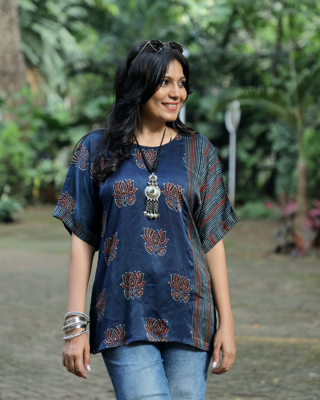 This modal short kurti features two distinct hand block prints a floral lotus motif on...