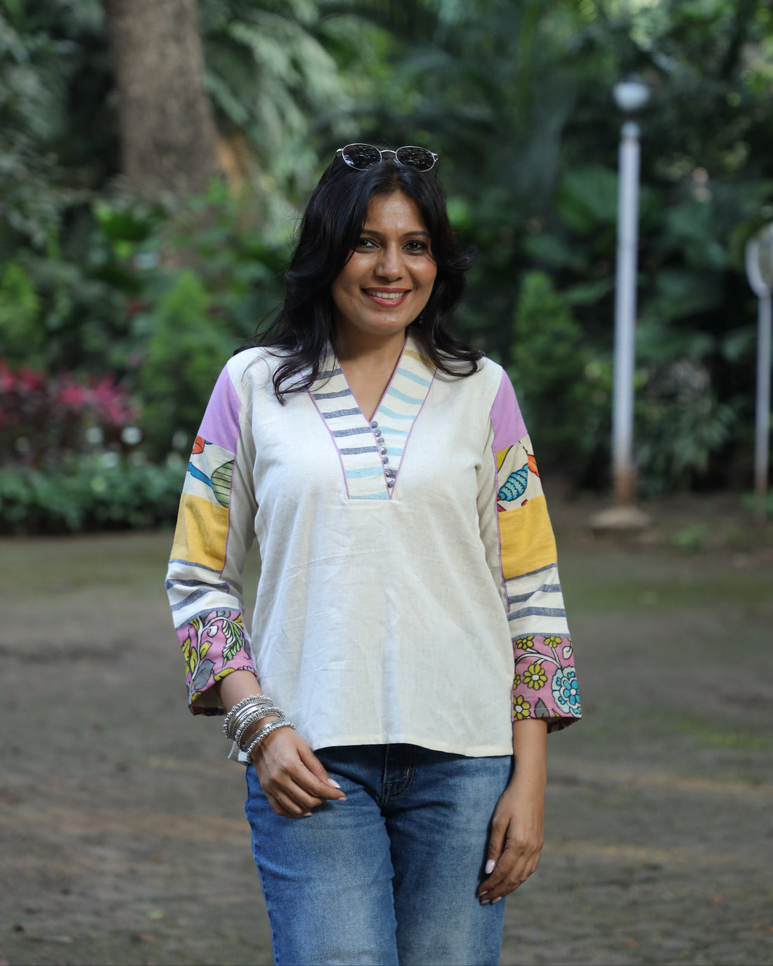 This cotton shirt top beautifully blends artistry and comfort. It features hand-painted Kalamkari and Kala...