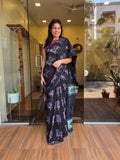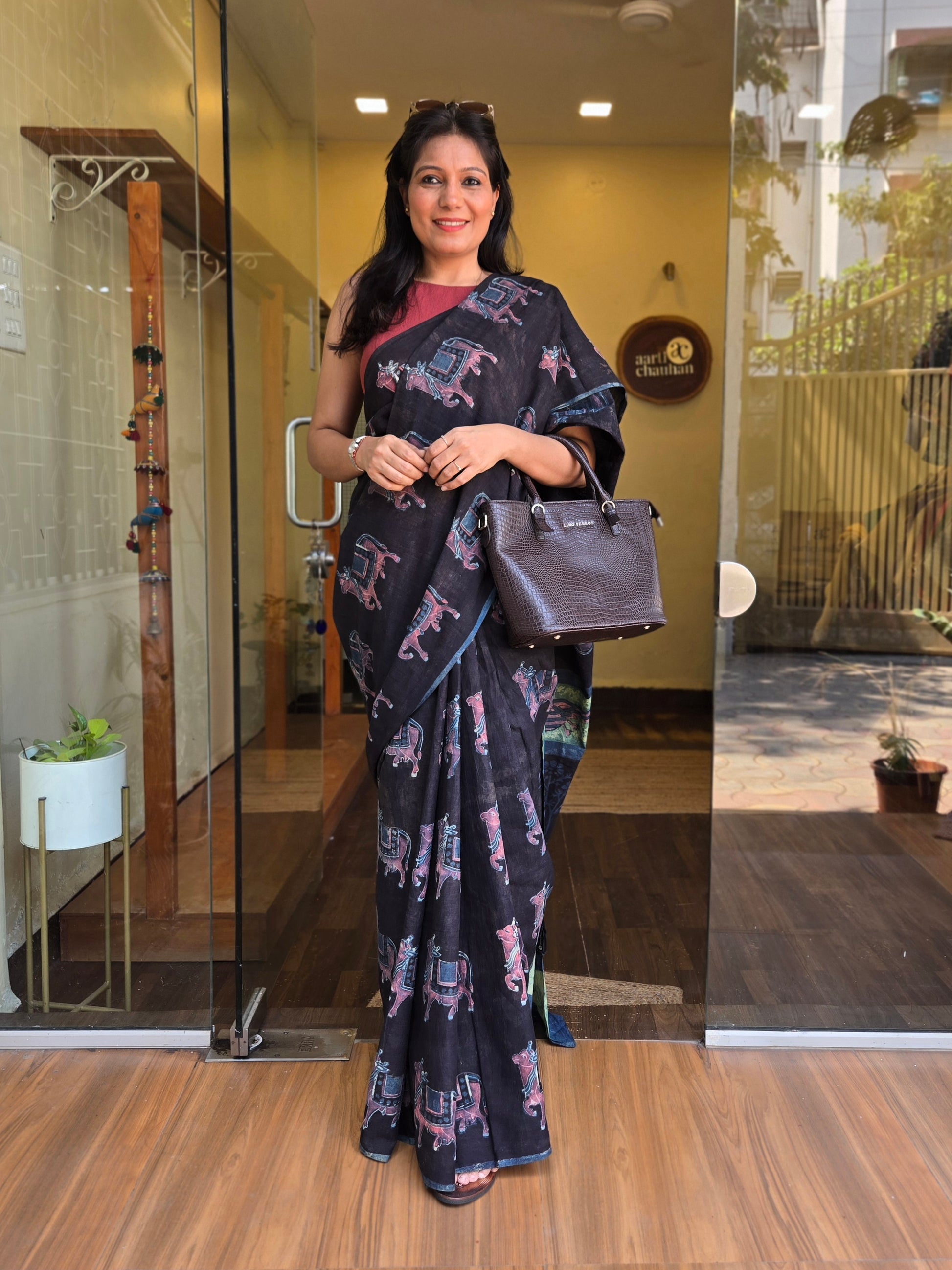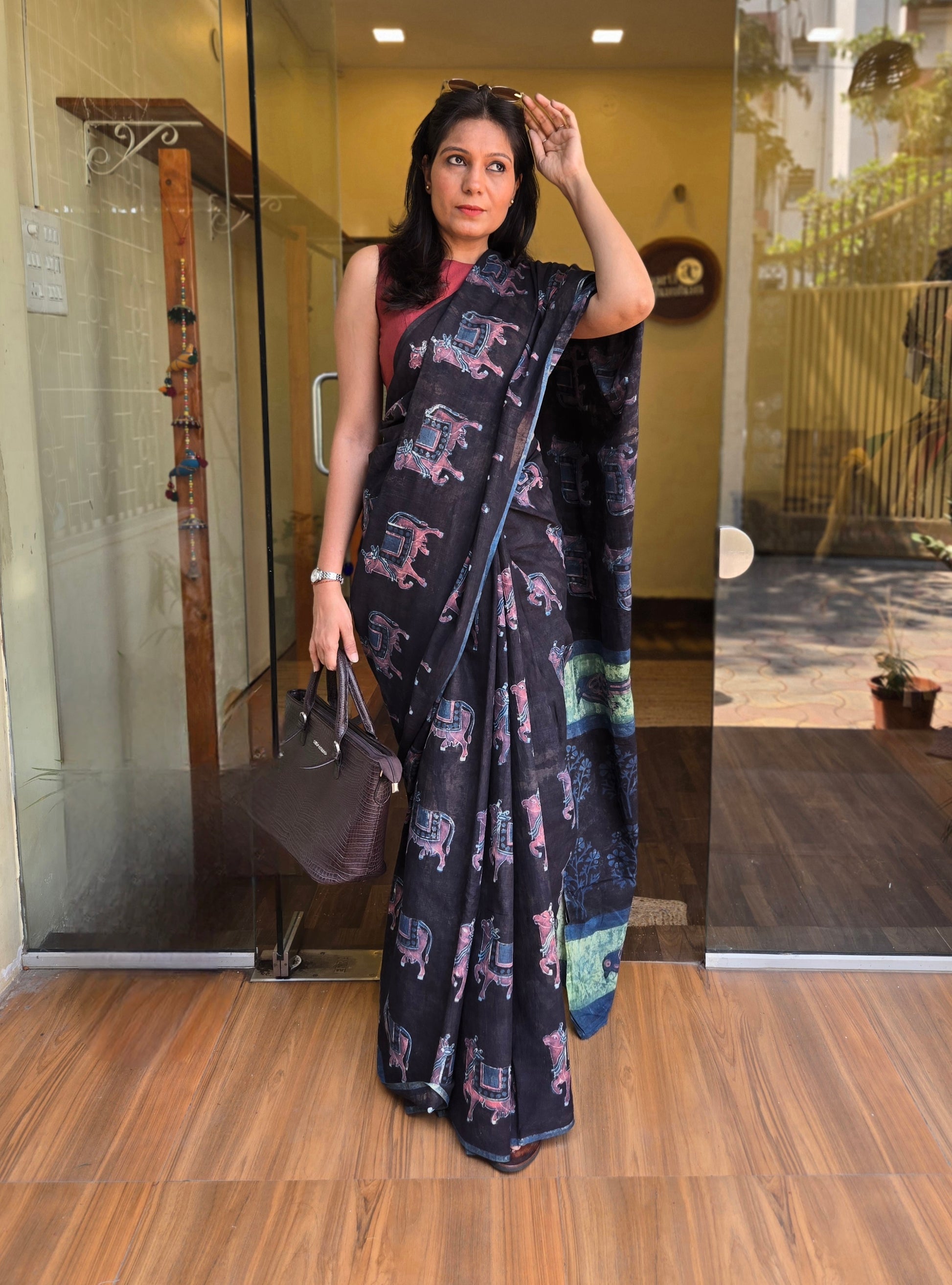 This elegant cotton saree features traditional block-printed motifs inspired by Pichwai art, with charming bird motifs on the pallu border and stylized trees and cow motifs scattered across the body. Naturally dyed using pomegranate rinds rich in tannins, it acts as a natural mordant, allowing the colors to bond beautifully and last longer on cotton. The earthy tones and handcrafted detailing add timeless artisanal charm. Comes with a matching running blouse piece for a complete, sustainable look.