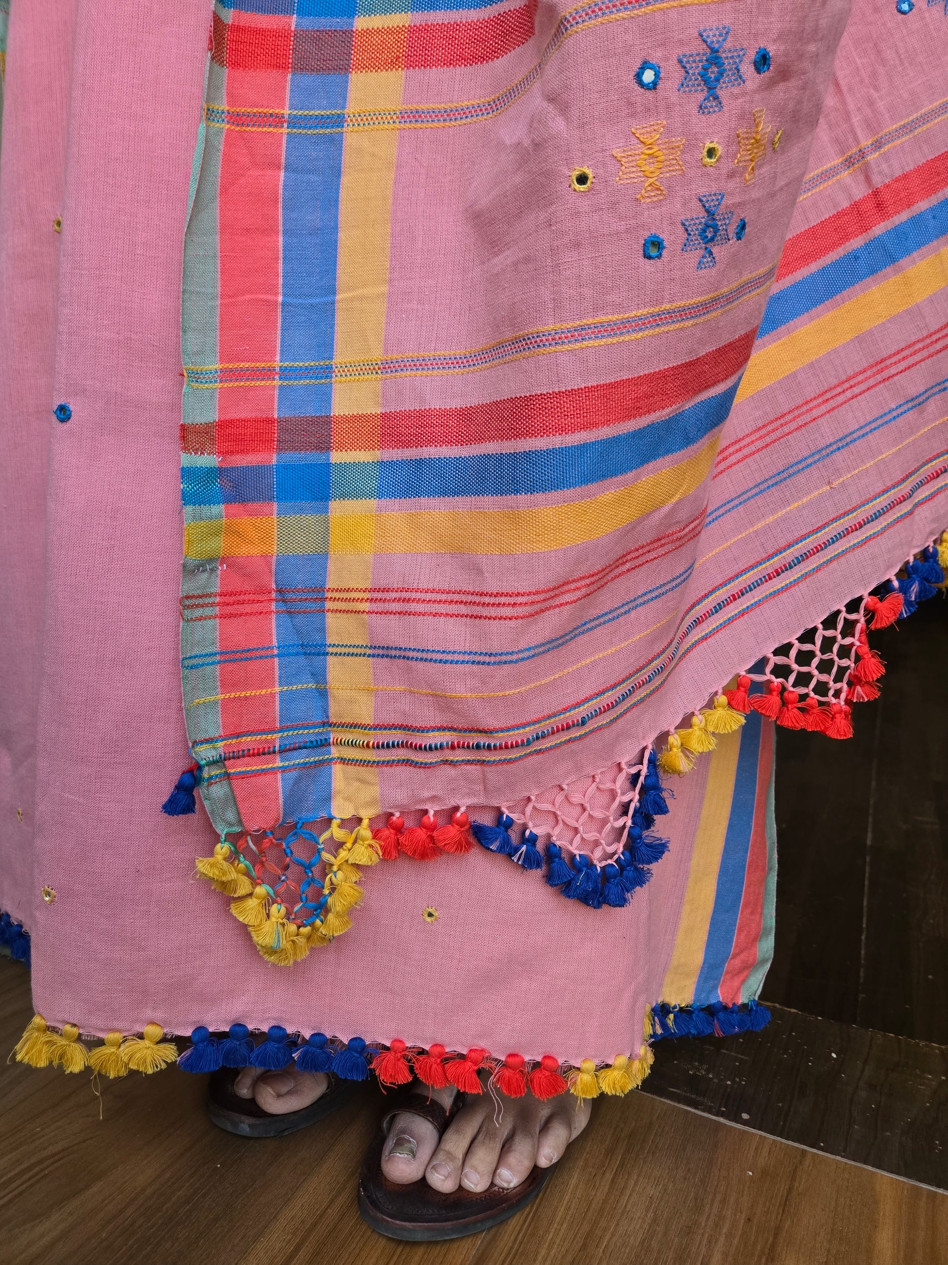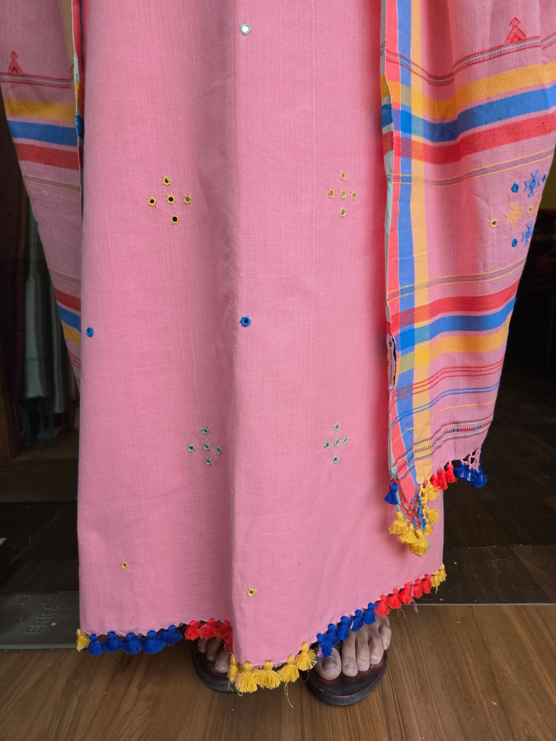 Product Description- This elegant unstitched 3-piece suit set features a kurta, dupatta, and bottom crafted from soft handwoven cotton with refined Chomak weaving. The kurta is adorned with delicate real mirror (miri) work and finished with handmade tassels along the edges for a graceful traditional touch. Paired with it is a beautifully detailed dupatta showcasing fine weaving, hand-knotted net accents, vibrant tassels, and a subtle zari border, making the set rich, timeless, and effortlessly ethnic.