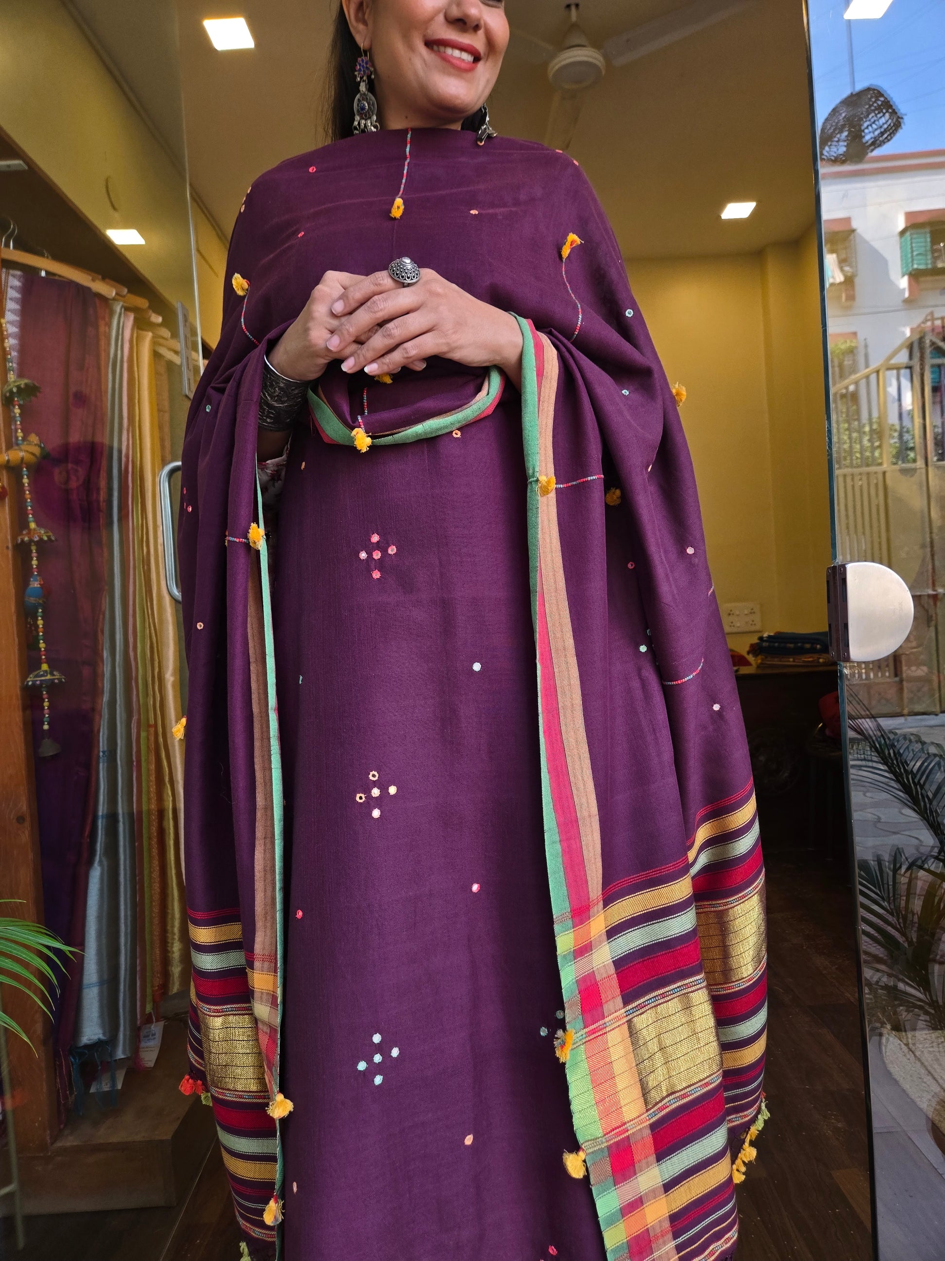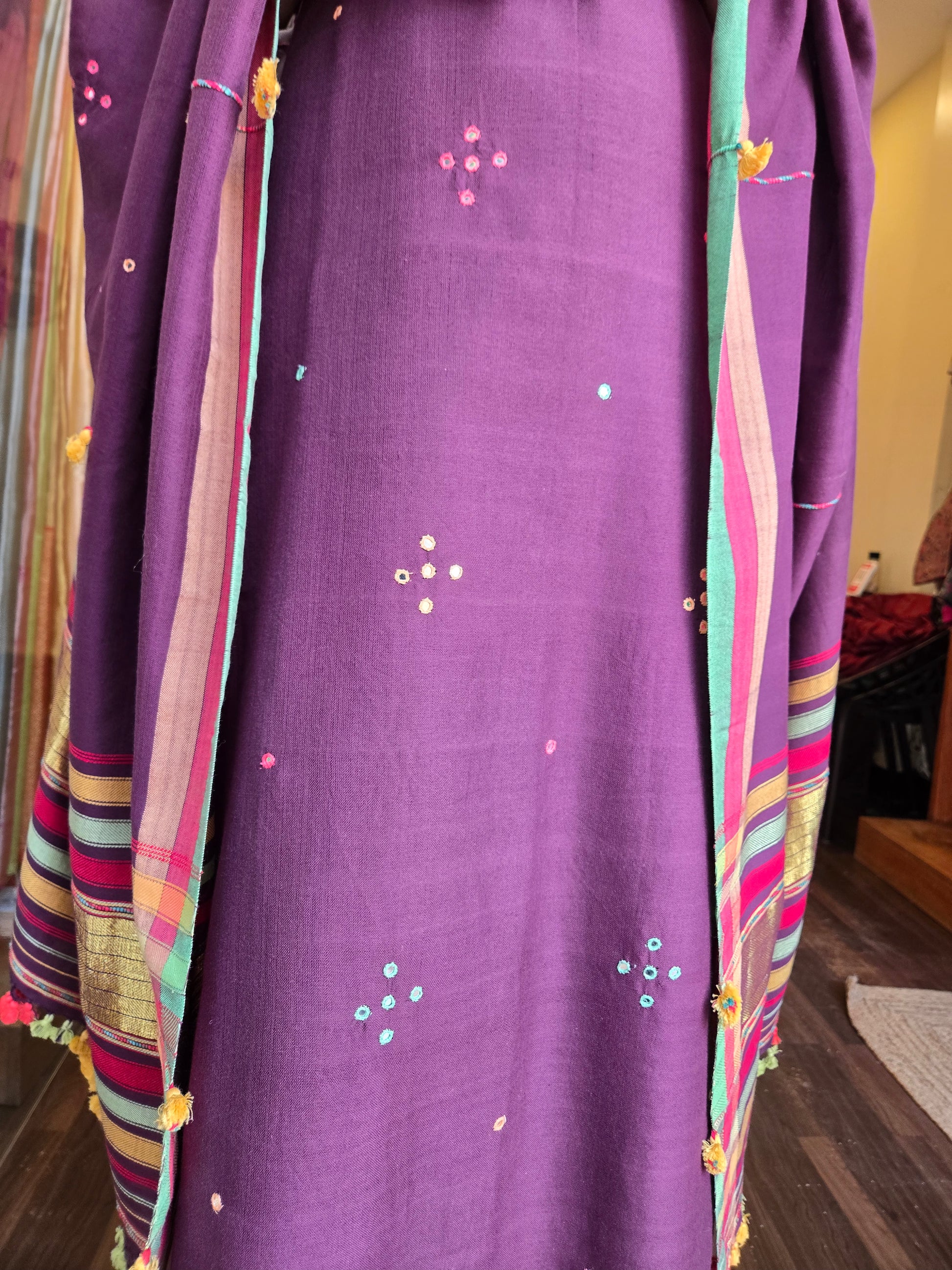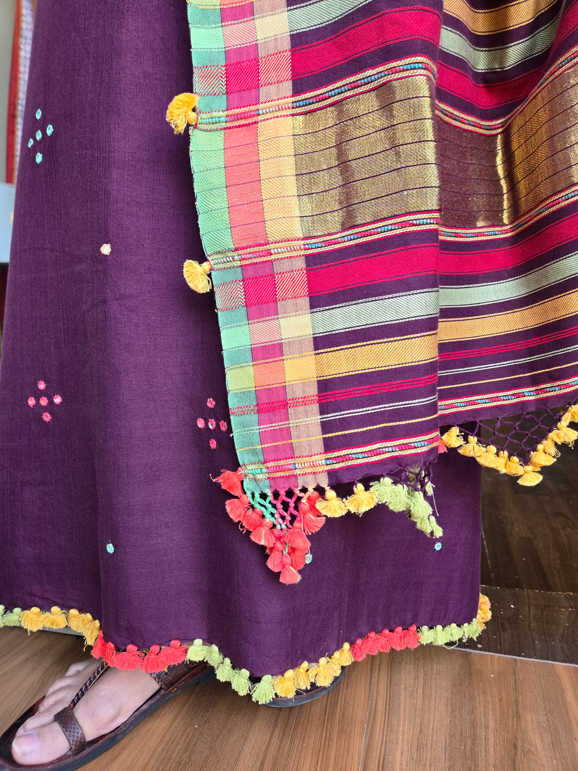 Product Description- This elegant unstitched 3-piece suit set features a kurta, dupatta, and bottom crafted from soft handwoven cotton with refined Chomak weaving. The kurta is adorned with delicate real mirror (miri) work and finished with handmade tassels along the edges for a graceful traditional touch. Paired with it is a beautifully detailed dupatta showcasing fine weaving, hand-knotted net accents, vibrant tassels, and a subtle zari border, making the set rich, timeless, and effortlessly ethnic.