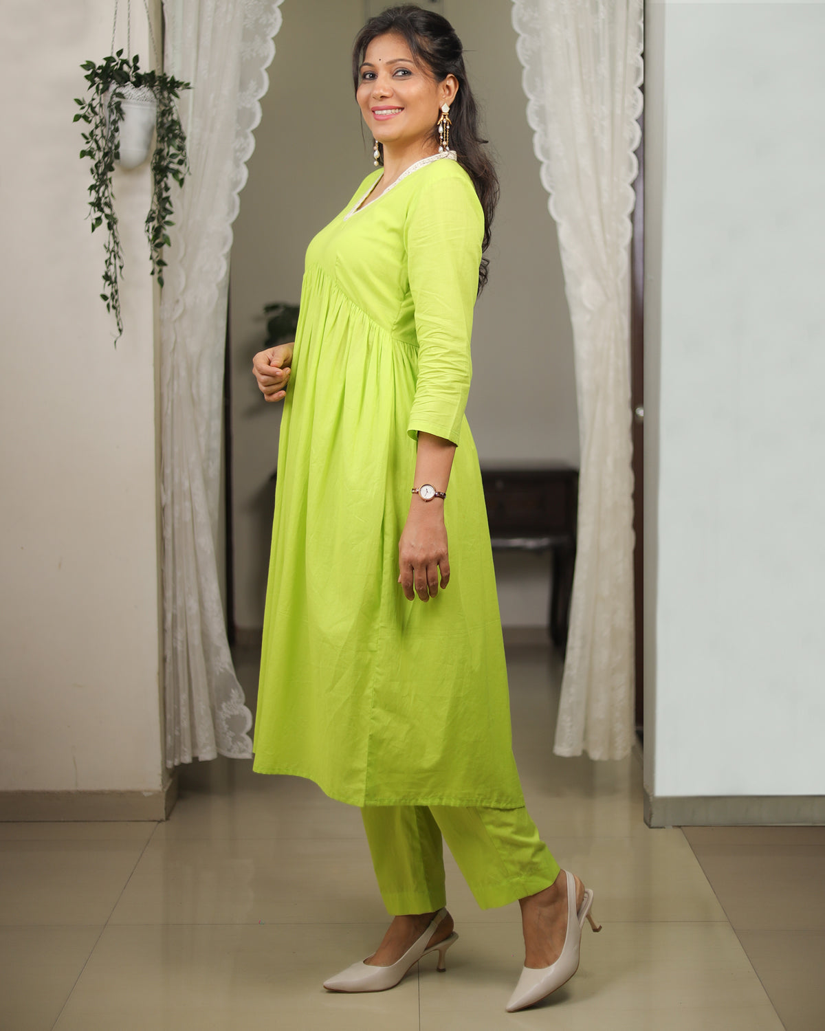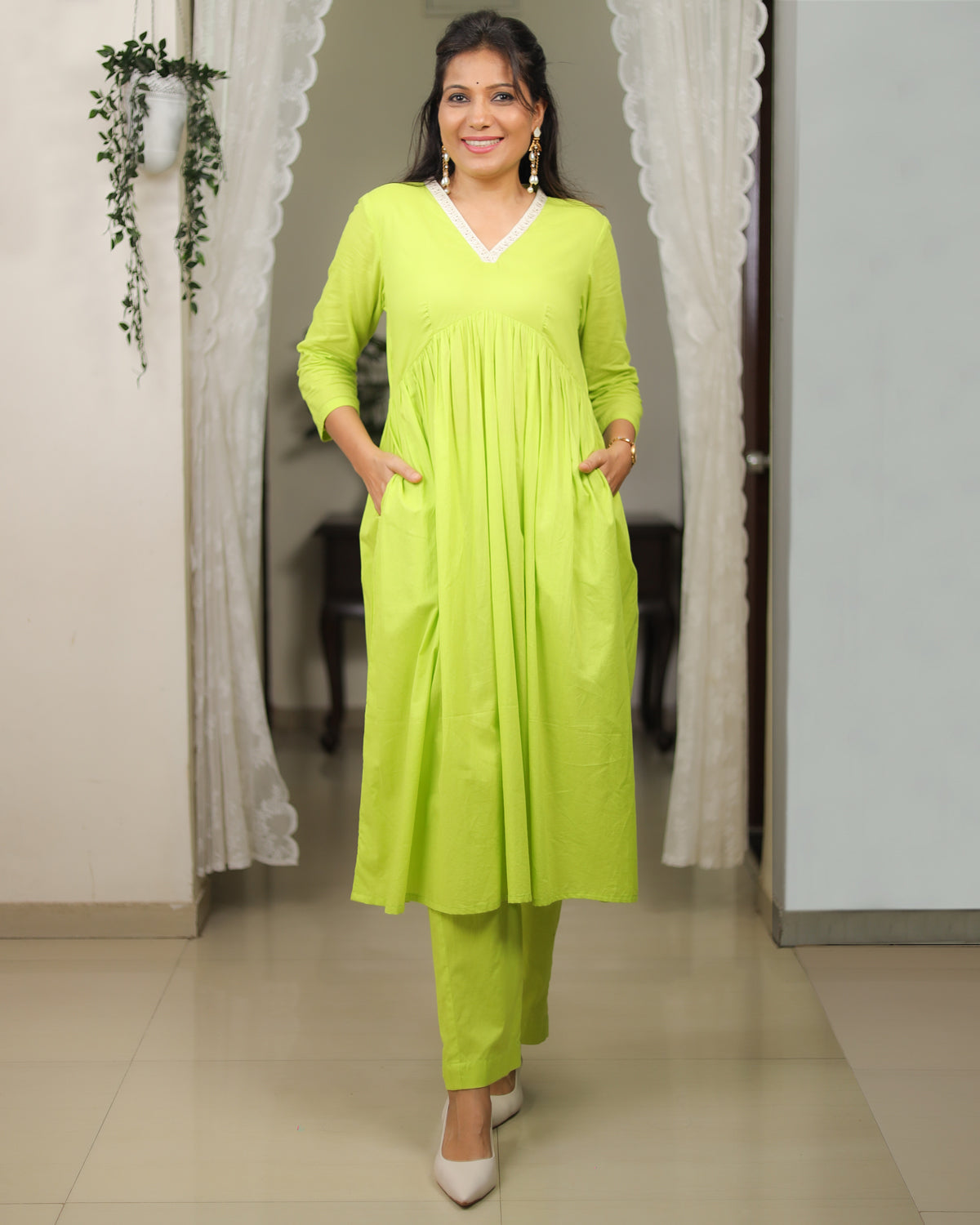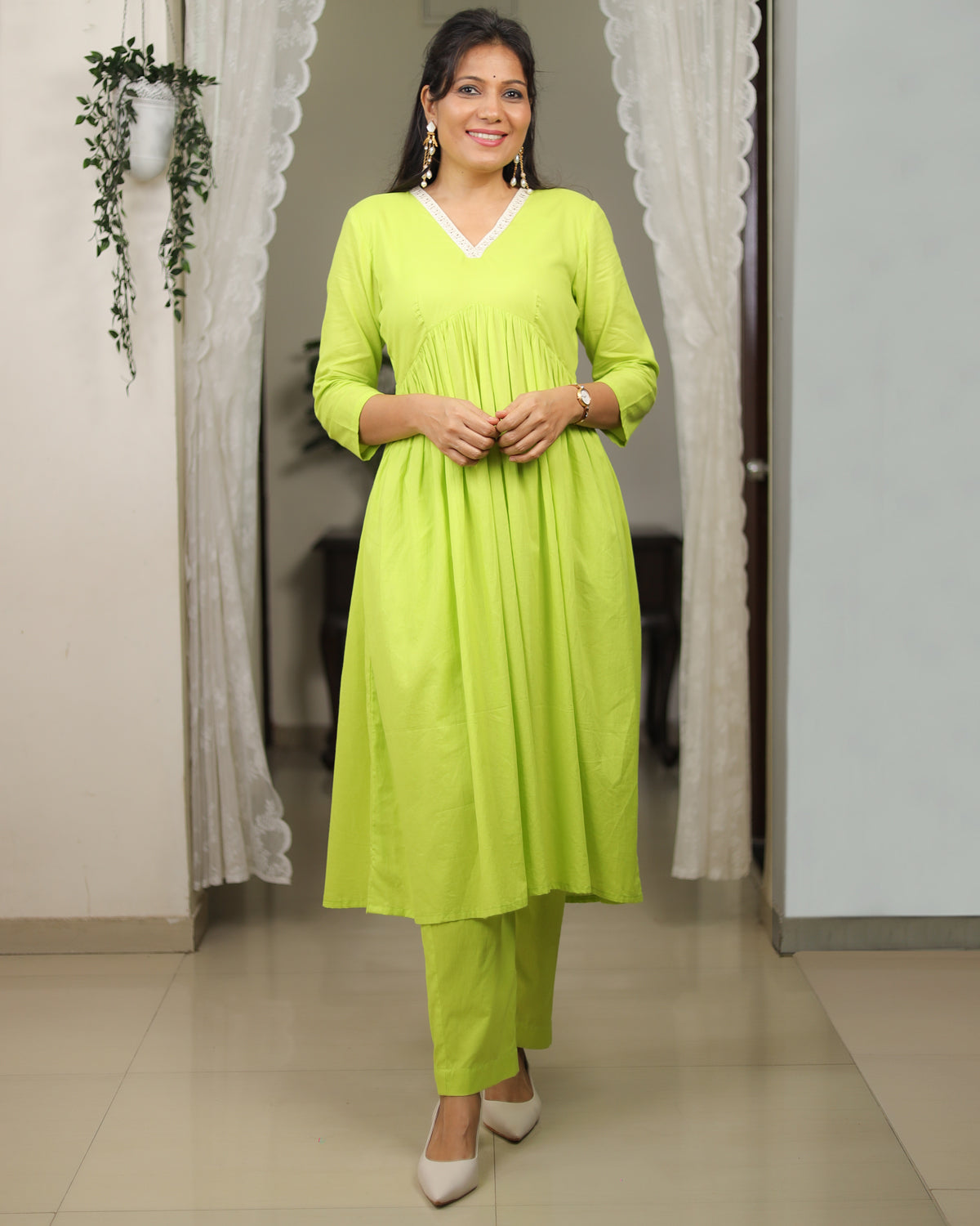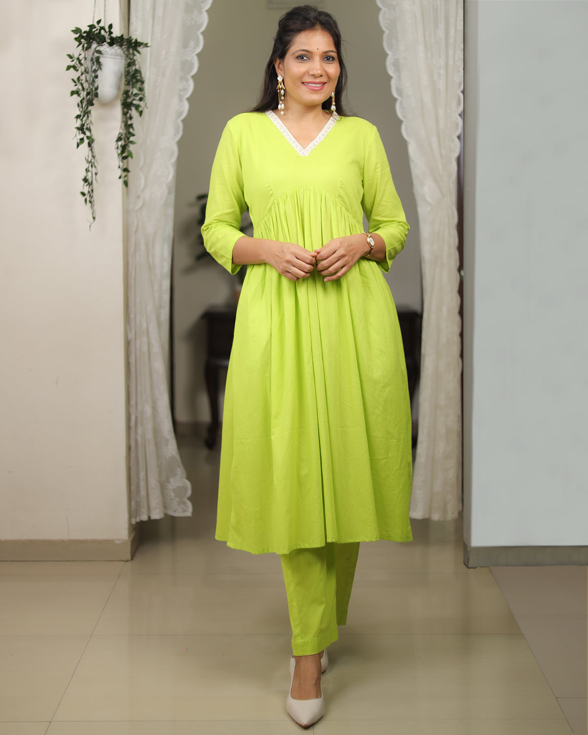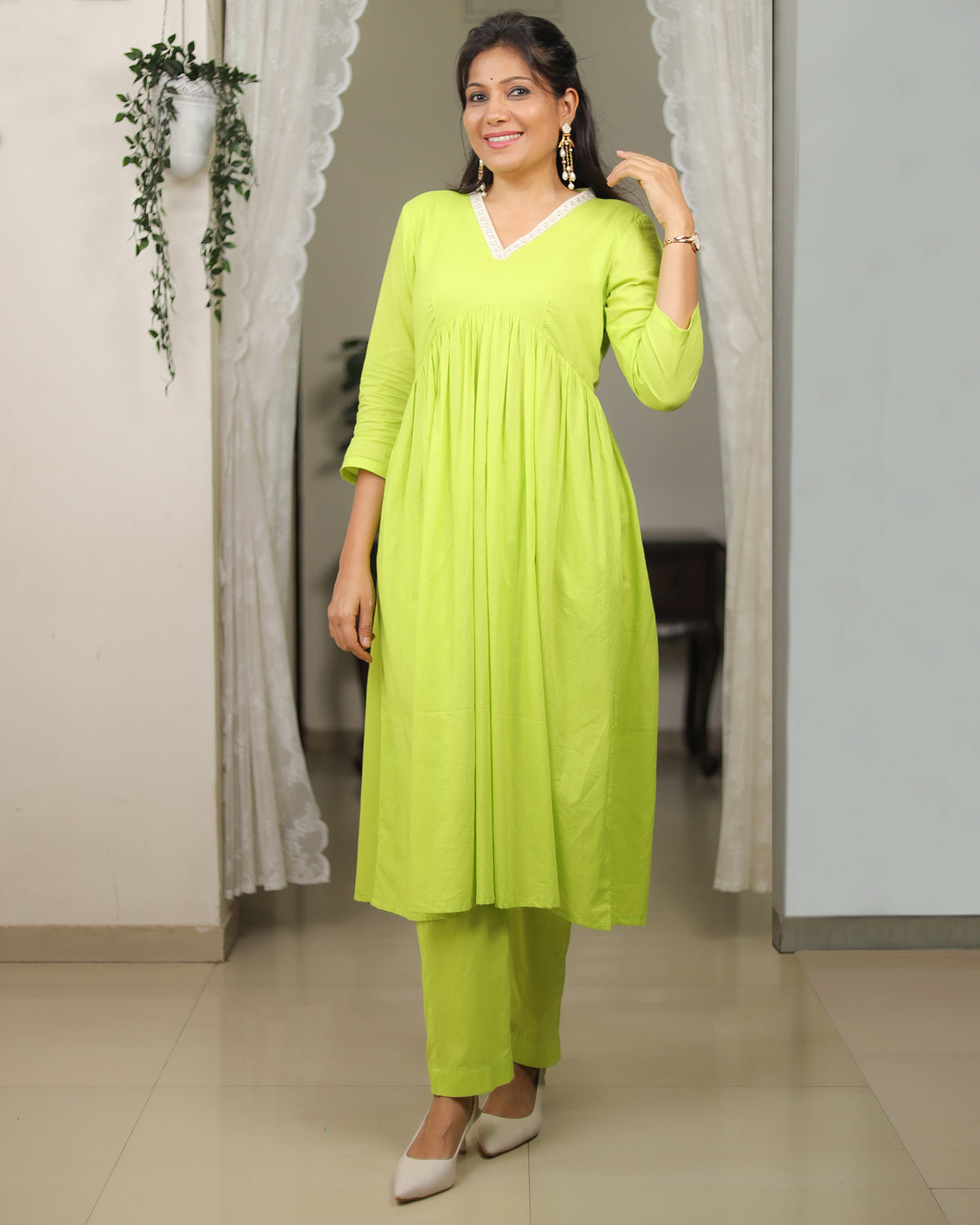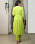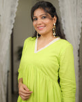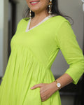This co-ord set is crafted from soft mul cotton with a smooth mul lining, ensuring all-day comfort and effortless drape. The neckline is highlighted with a delicate white floral lace, adding a touch of femininity to the look. The yoke features fine gathers that fall beautifully, creating a flowy, flattering silhouette. Paired with same-fabric straight pants, this set brings together freshness, elegance, and everyday ease in the prettiest shade of green.