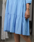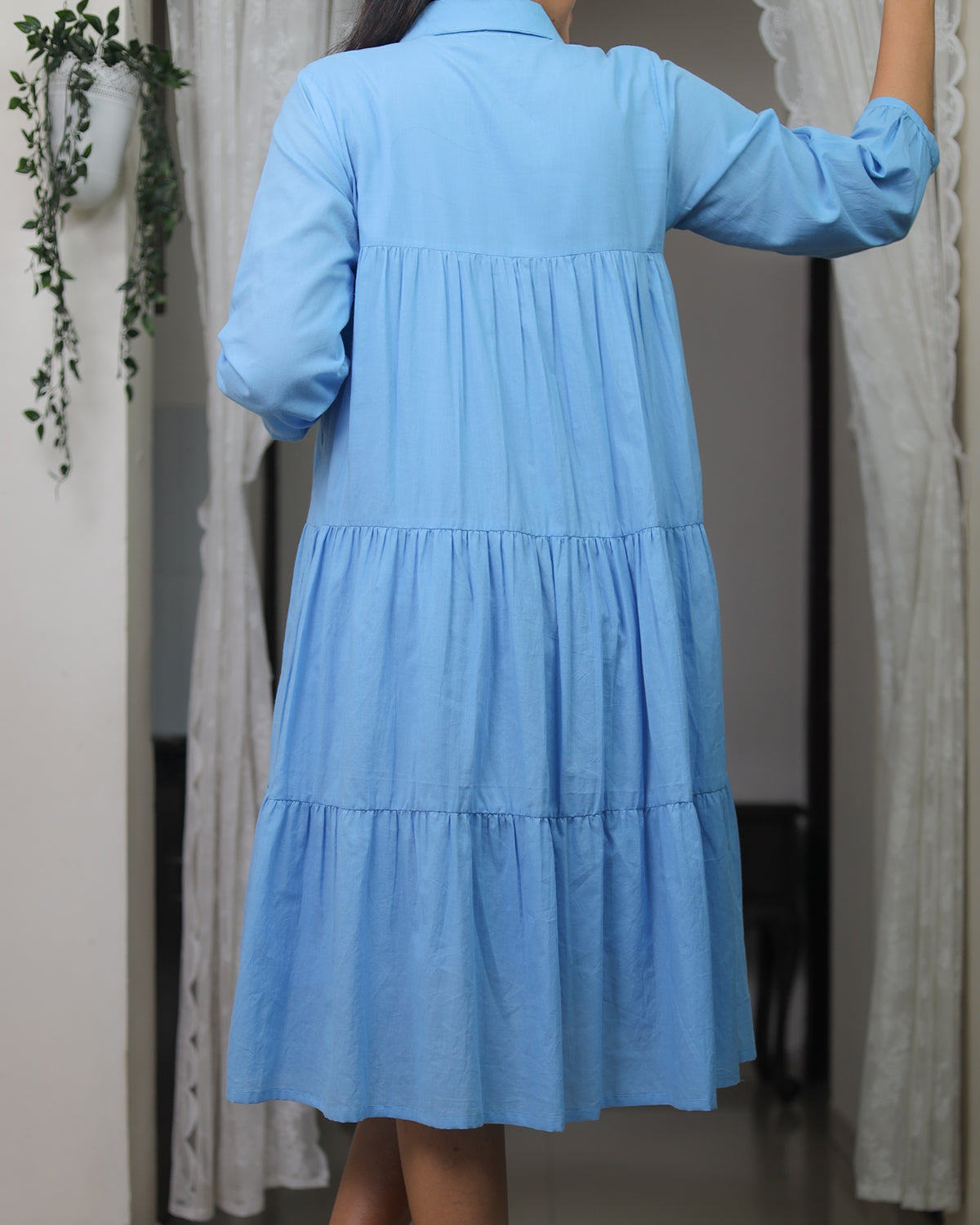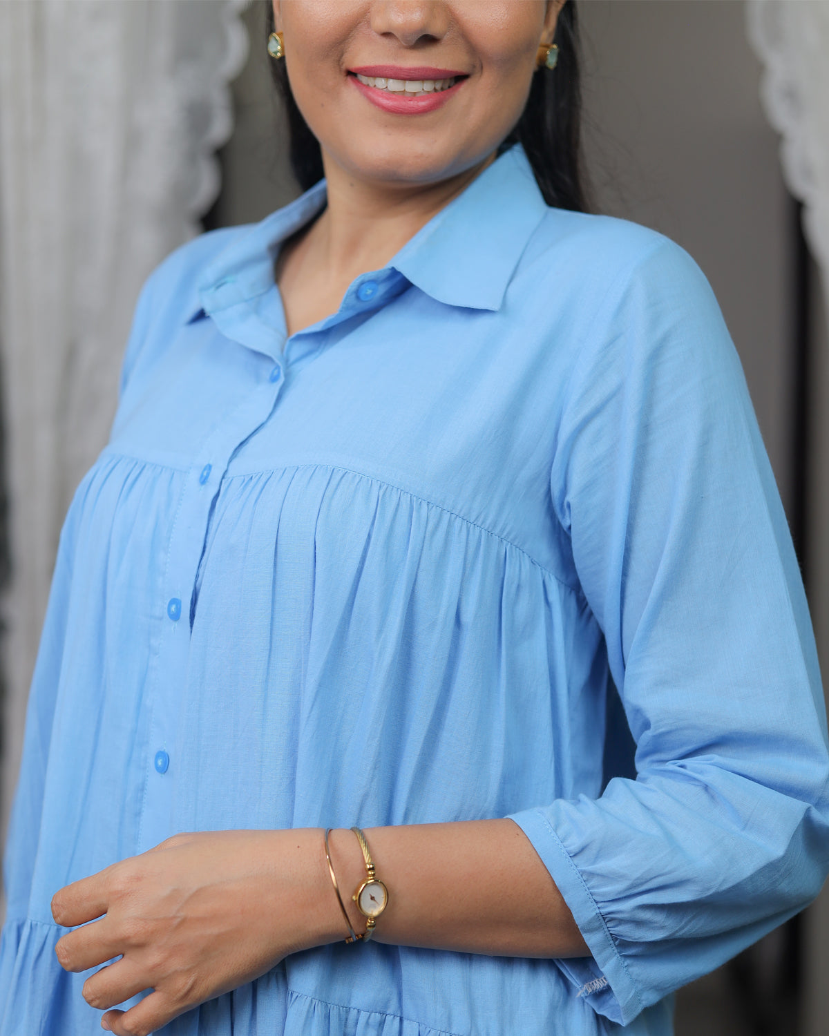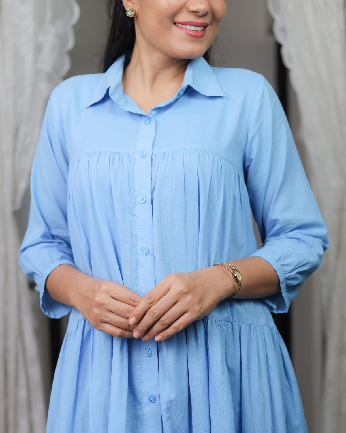 This dress is crafted in soft mul cotton with a smooth mul lining, giving it a light and airy feel. It features a three-layered silhouette with beautiful gathers that create natural volume and movement. The shirt collar adds a classic touch, complemented by a full button-down front for effortless wear. A breezy, comfortable, and elegant style perfect for everyday chic.