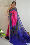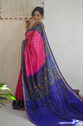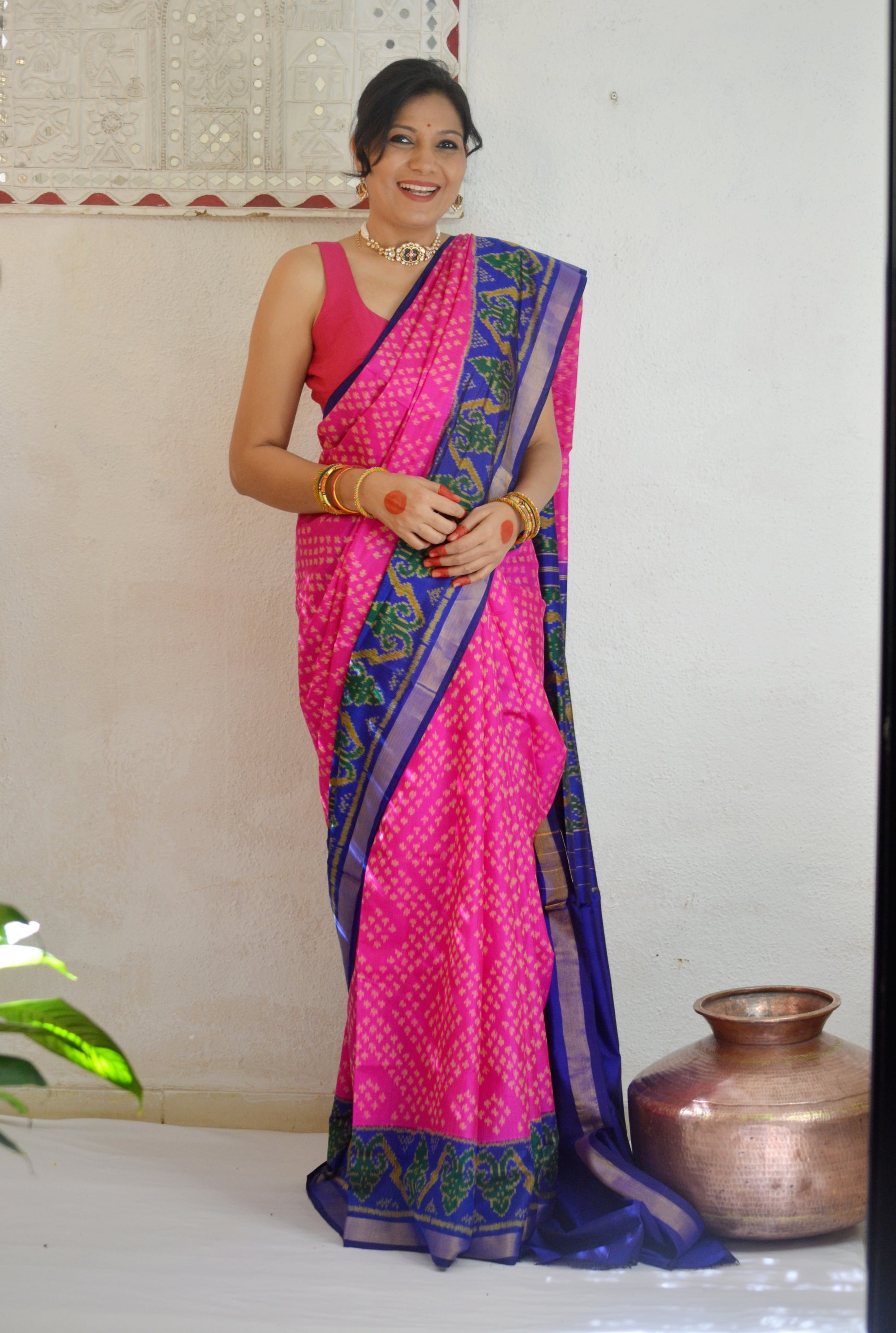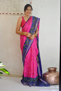 This Rajkot Patola silk saree features a bright pink body with delicate ikat-style butti motifs, beautifully contrasted by a royal blue border and pallu. Accented with traditional geometric and floral patterns, it reflects timeless heritage craftsmanship. The saree comes with a coordinated plain blouse piece, making it ideal for festive and cultural occasions.
