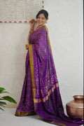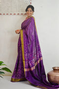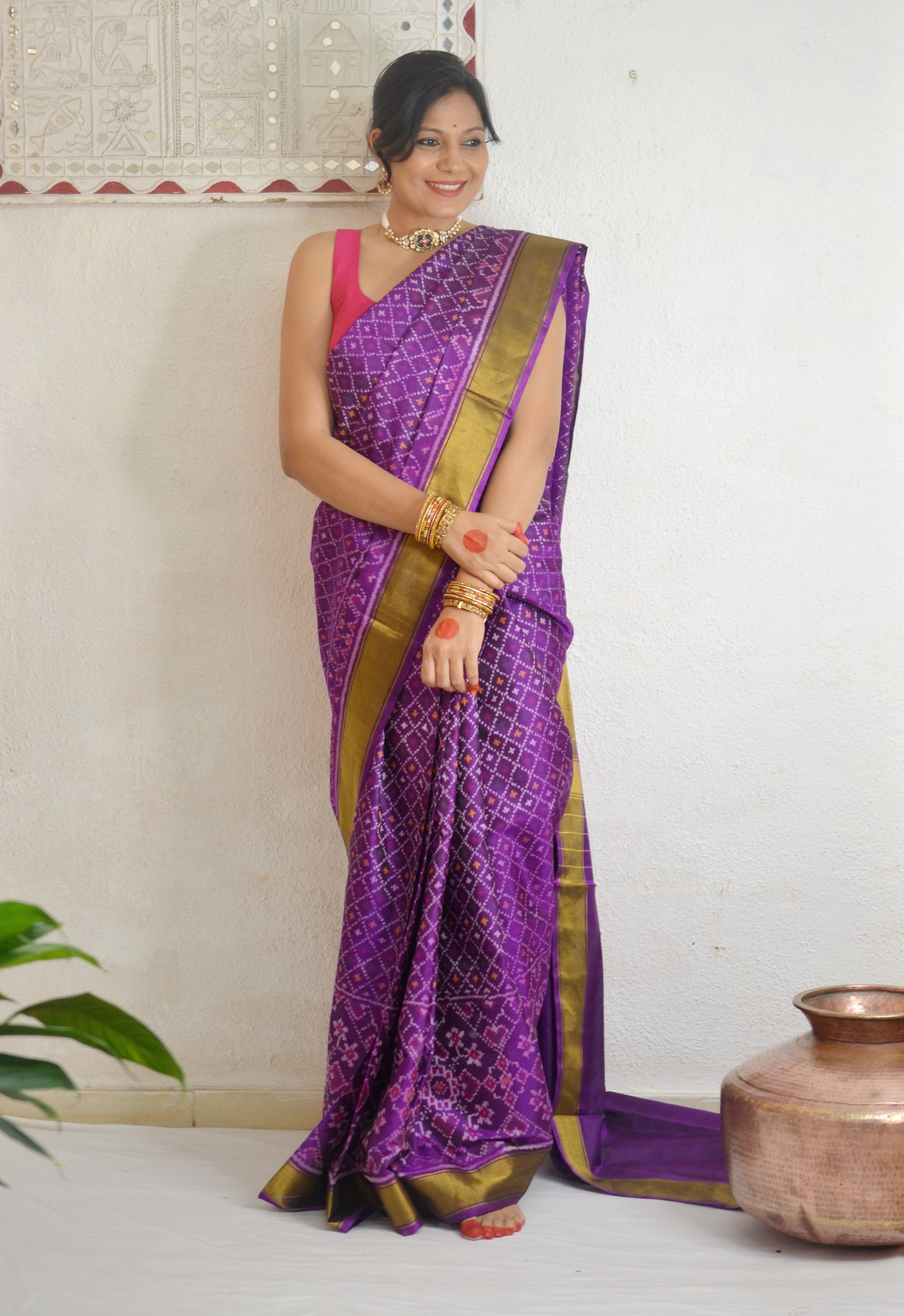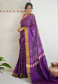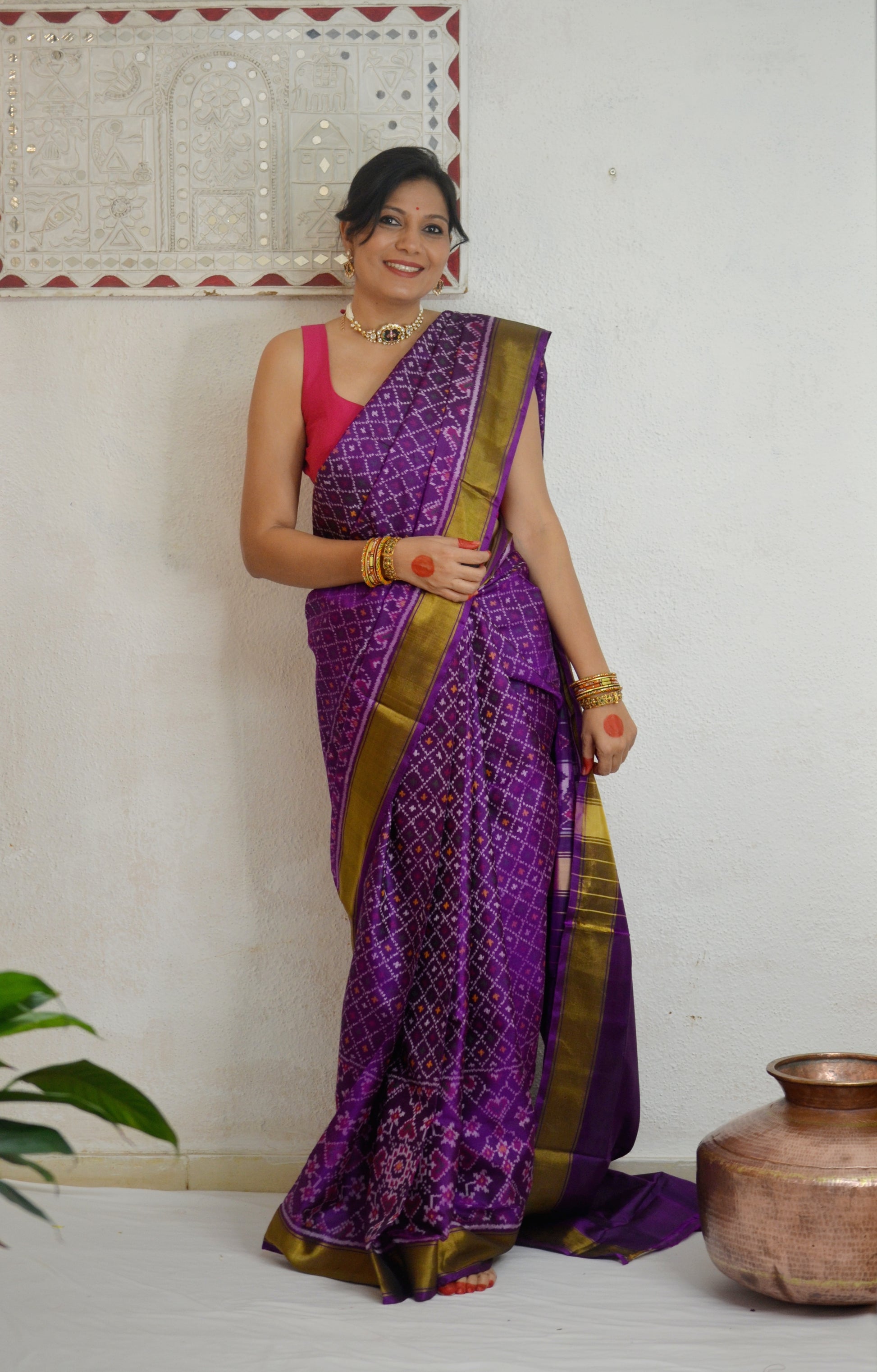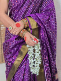This Rajkot Patola saree is woven in pure mulberry silk with a rich deep purple tone and a soft natural sheen. Decorated with classic Patola motifs in floral, geometric, and stylised forms, it is beautifully complemented by striped and diamond-patterned borders and pallu. Lightweight yet luxurious, this saree reflects traditional craftsmanship and is perfect for weddings, festive occasions, and cultural celebrations.