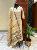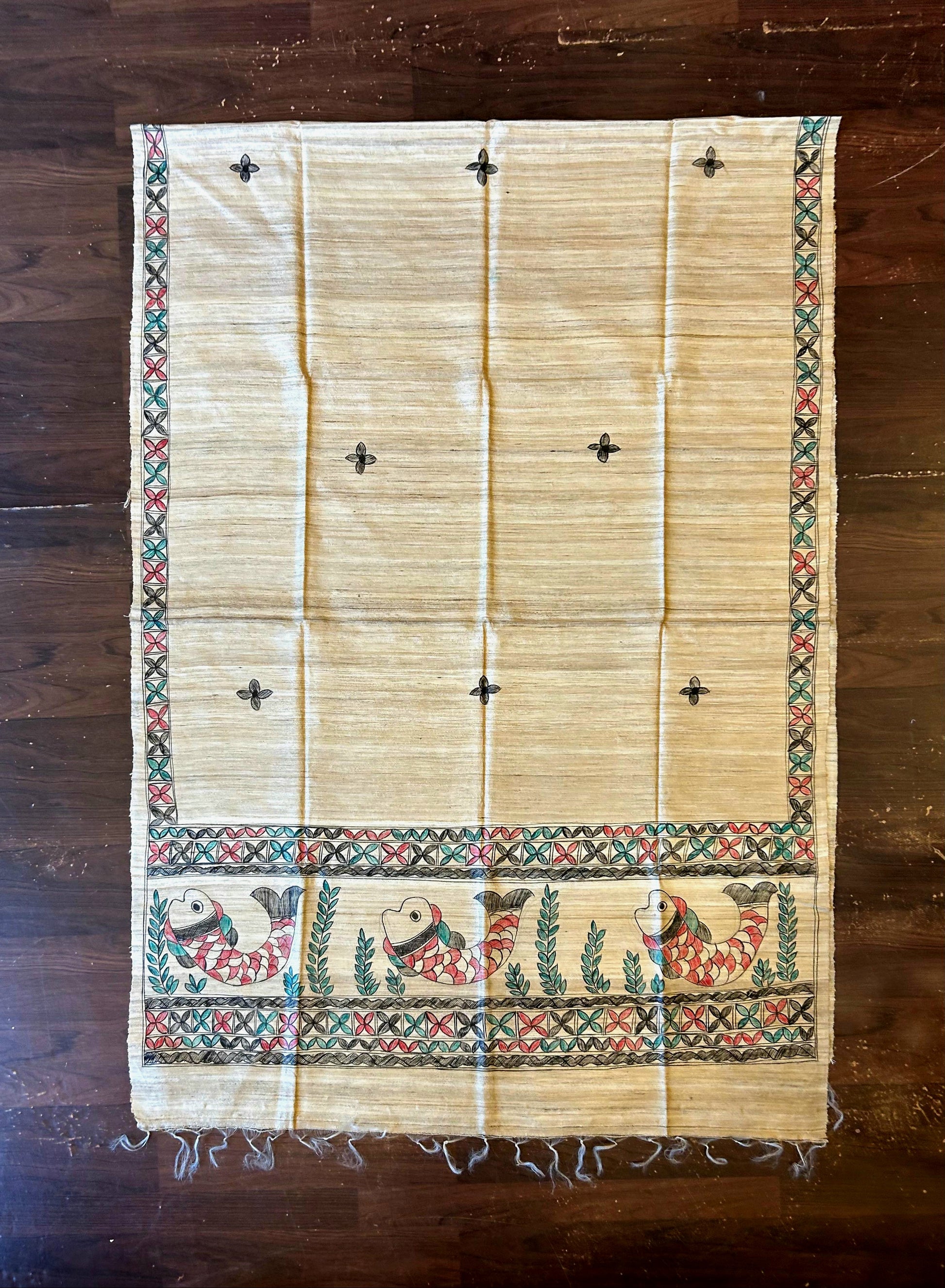 Madhubani handpainted tussar ghicha silk dupattas bring a rare combination of culture and tradition mix with modernity.Natural dyes and pigments were used to make eye-catching geometrical patterns.length of the dupatta is 2.5 mtr. Color may look slightly different in real than photos due to digital photography. Dry clean preferred.