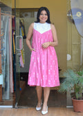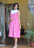 Product Description- An easy, breezy sleeveless dress crafted for relaxed days and sunny getaways. It features a delicate schiffli-embroidered yoke with soft cotton lining, flowing into airy pink ikkat gathers enhanced with lightweight mul lining for comfort and movement. Designed with a clean armhole incut and subtle sleeping collar, the dress is finished with a neat back hook and eye opening for easy wear. A functional pocket adds everyday practicality, making this piece effortlessly stylish and vacation-ready.