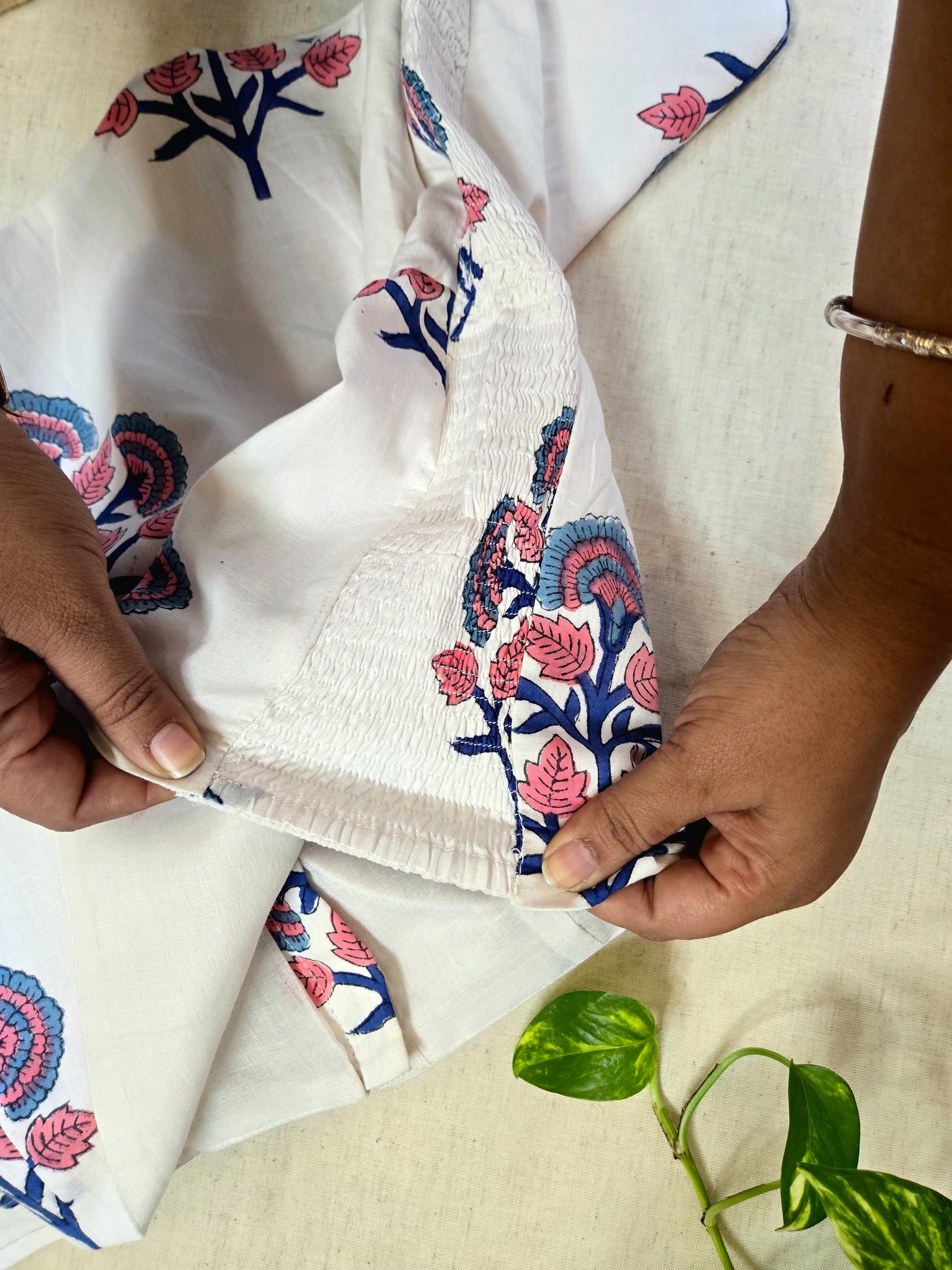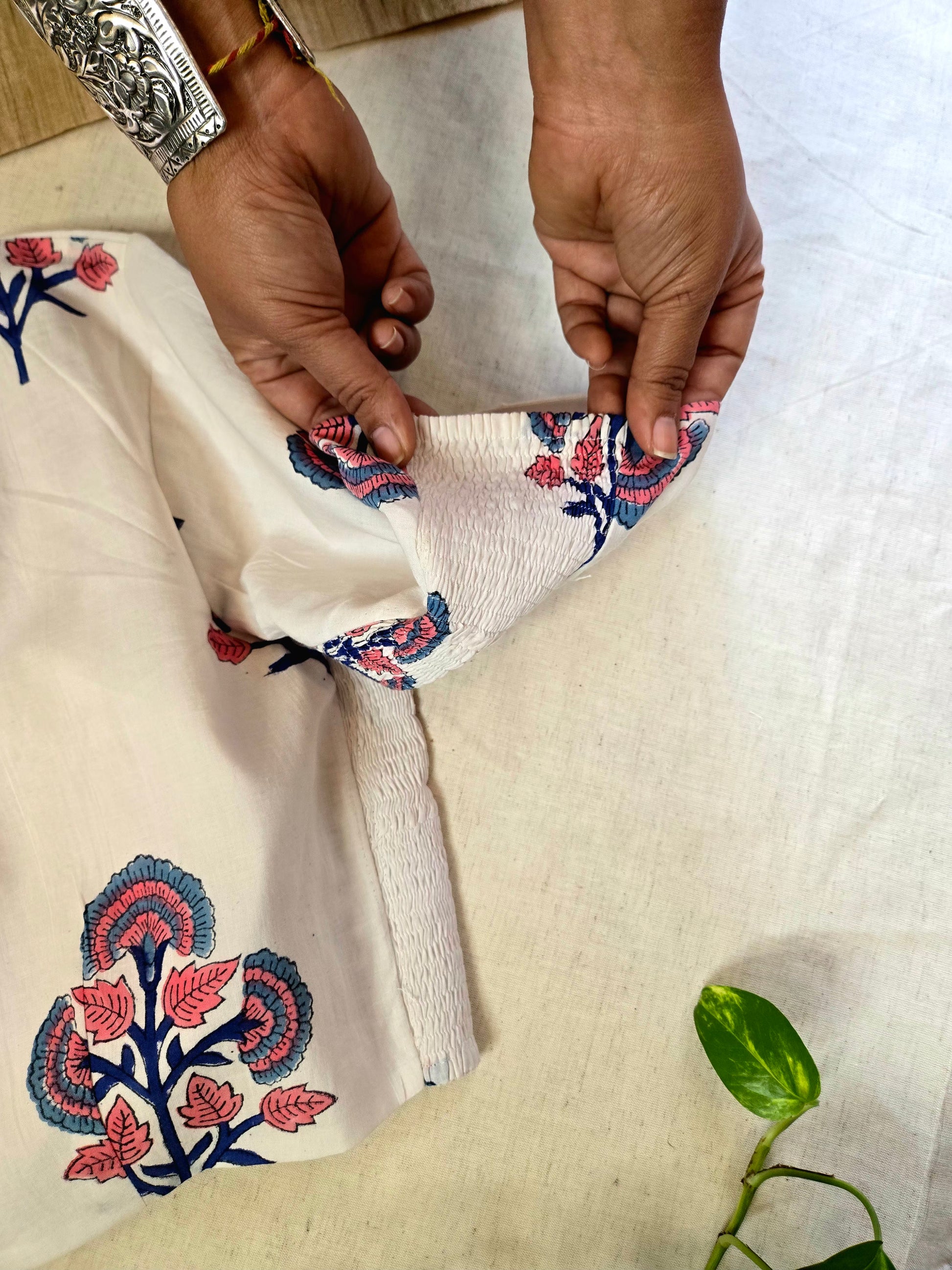 Product Description- This Mughal butta–inspired blouse crafted in soft mul cotton, featuring full lining and padding for comfort. The innovative elasticated fit adapts smoothly to your body’s curves, giving a flattering and easy fit with an earthy, elegant appeal, gentle on the skin, and comfortable to wear it is finished with an round neck and subtle front opening perfect for pairing with cotton and handloom sarees.