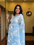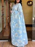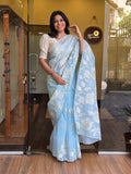 Elegant and lightweight, this sky blue Kota Doria saree features delicate embroidered floral vine motifs with graceful leaf patterns flowing across the body. The airy check weave of the fabric enhances its soft and breathable texture. Finished with scalloped embroidery on all sides, the saree offers a refined and feminine look. It comes with aÂ