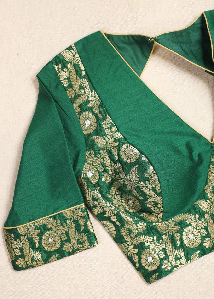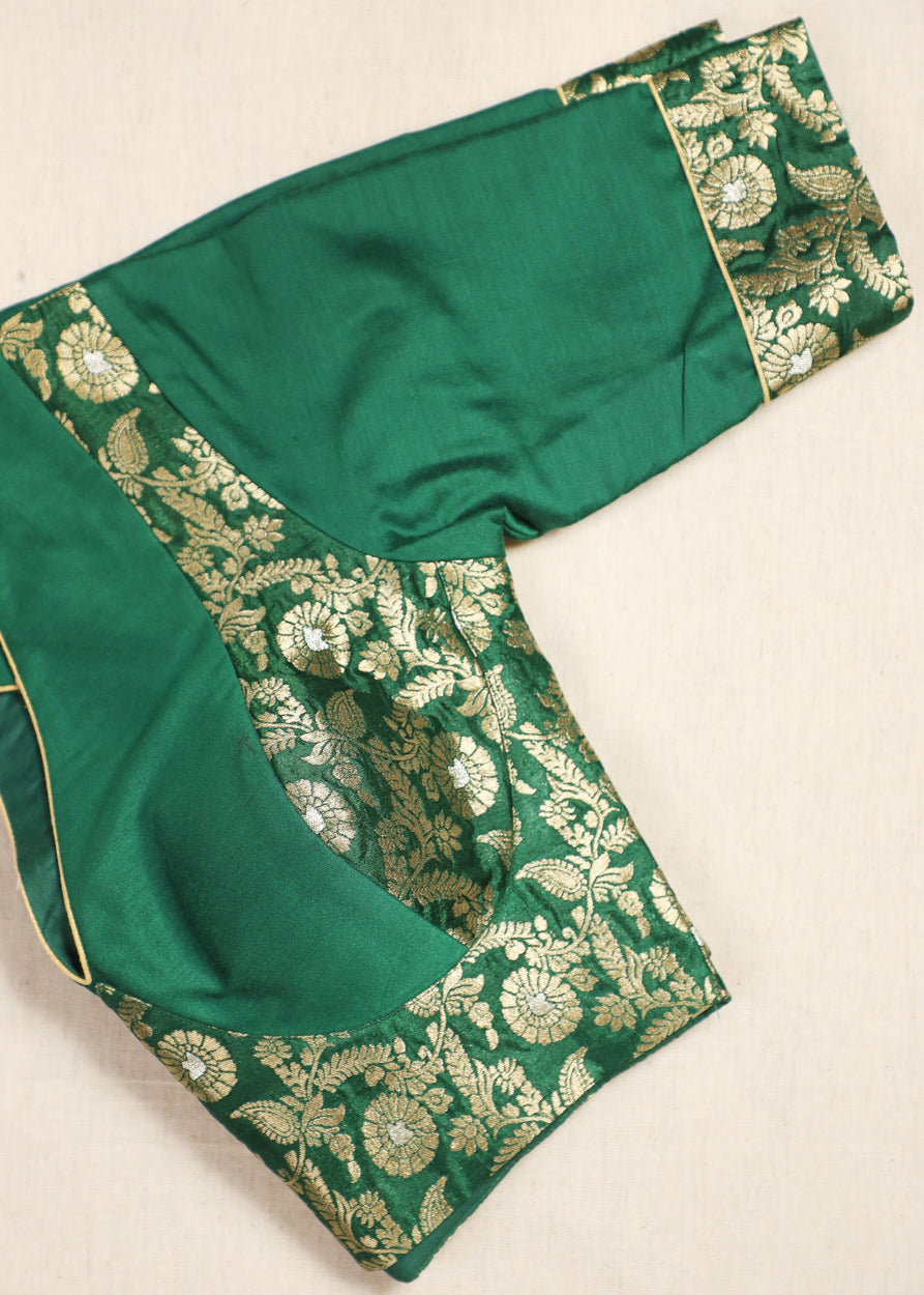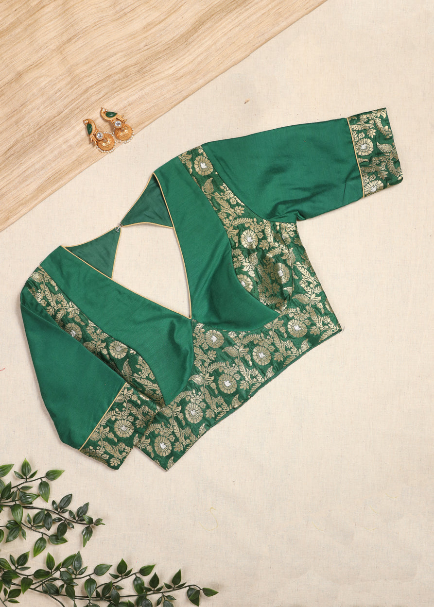 This exquisite green blouse is a perfect blend of elegance and tradition, enhanced with rich golden brocade work. The front features a bold deep V-neckline bordered with intricate floral brocade, lending a regal and festive charm. Elbow-length sleeves are highlighted with brocade borders, balancing simplicity with richness and padded for a neat fit. The back is designed with a striking deep leaf-shaped cut, with back open and outlined with sleek golden piping for a refined finish. The upper back is adorned with brocade detailing, seamlessly complementing the front design. This blouse is crafted to make a statement, ideal for pairing with silk sarees, brocade drapes, or lehengas for weddings, festive occasions, and grand celebrations.