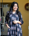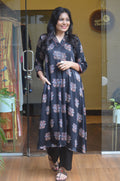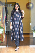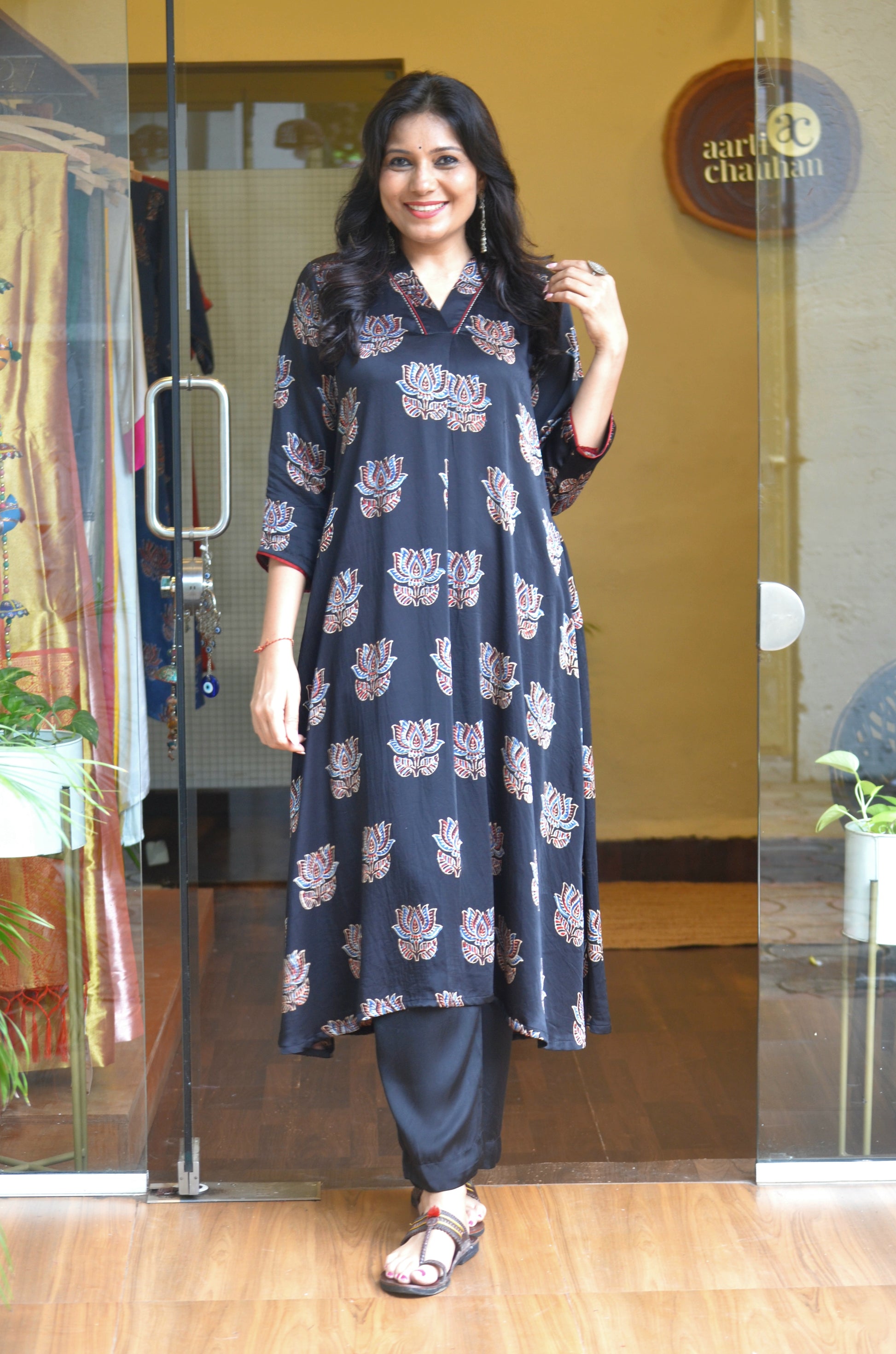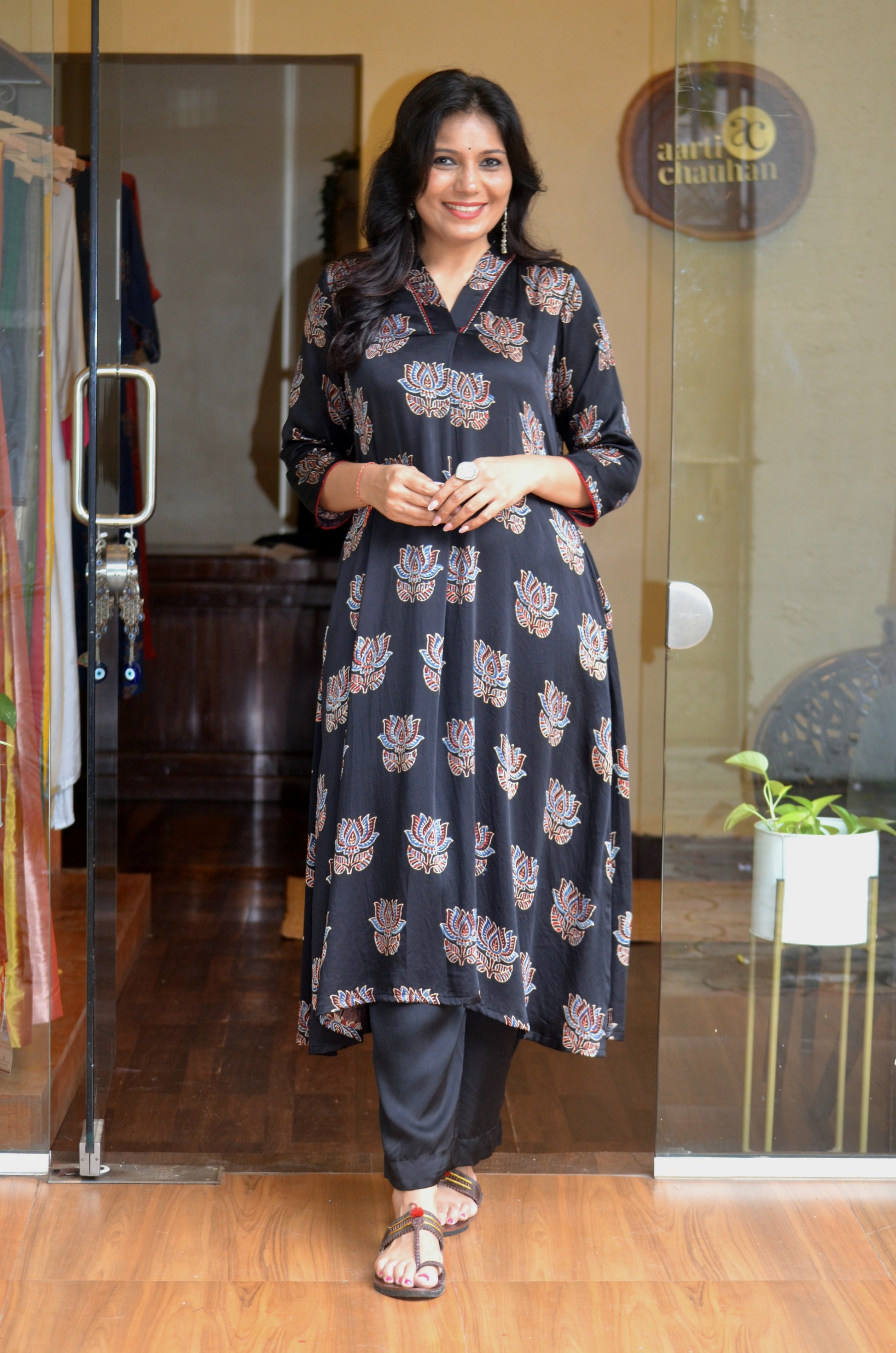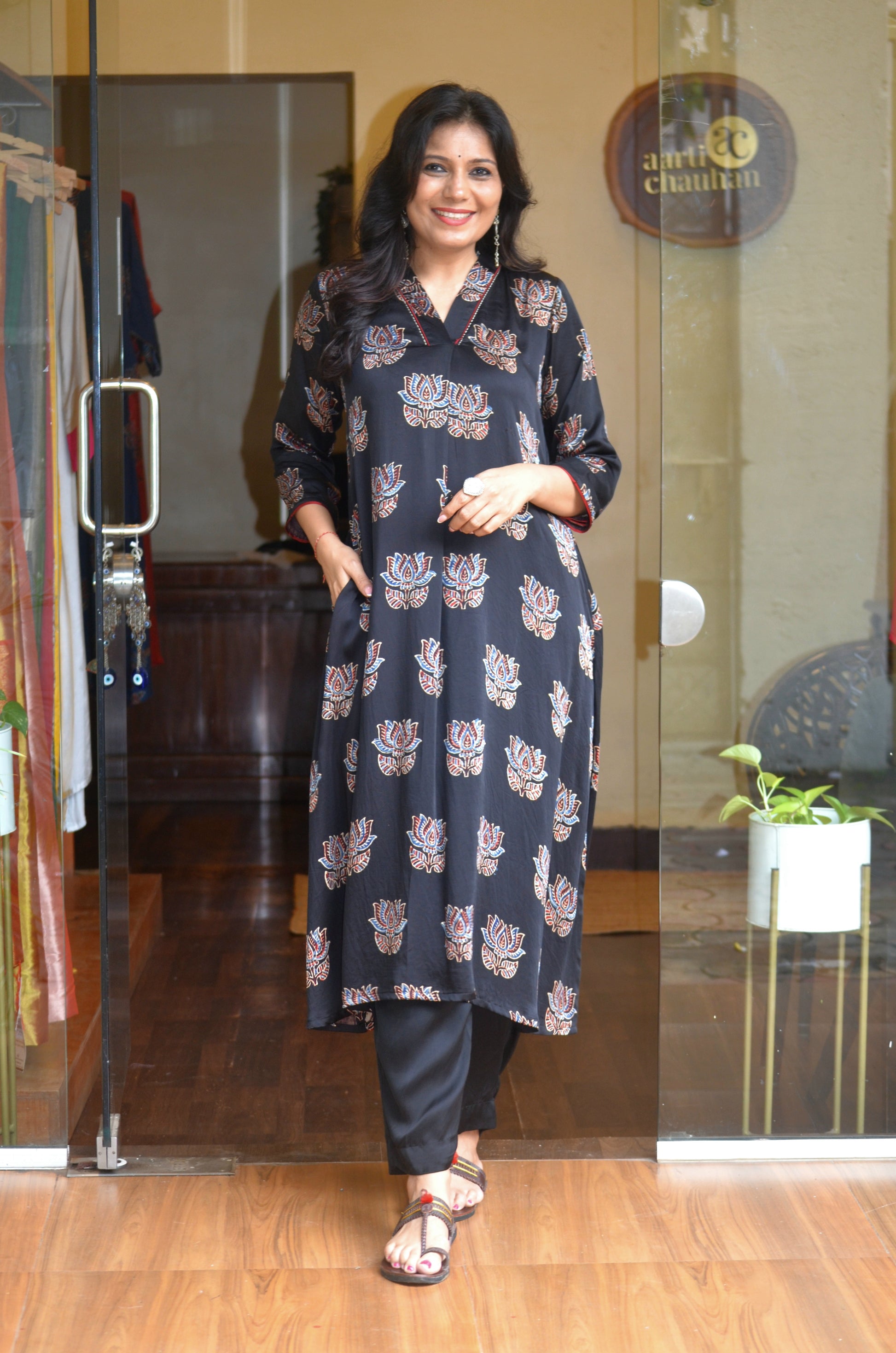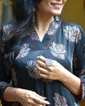 This is a graceful modal silk kurti designed with a rich and flowy drape that enhances its elegant look. It features hand kantha work on the neckline along with traditional hand block print lotus motifs in earthy tones of red, white, and blue on a deep base, giving it a striking yet subtle appeal. With a length of 45 inches, it falls beautifully, making it perfect for both casual and semi-formal wear. The 3/4th sleeves and the neat finishing with contrast piping on the neck and sleeve edges complete the design with a refined touch.