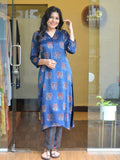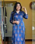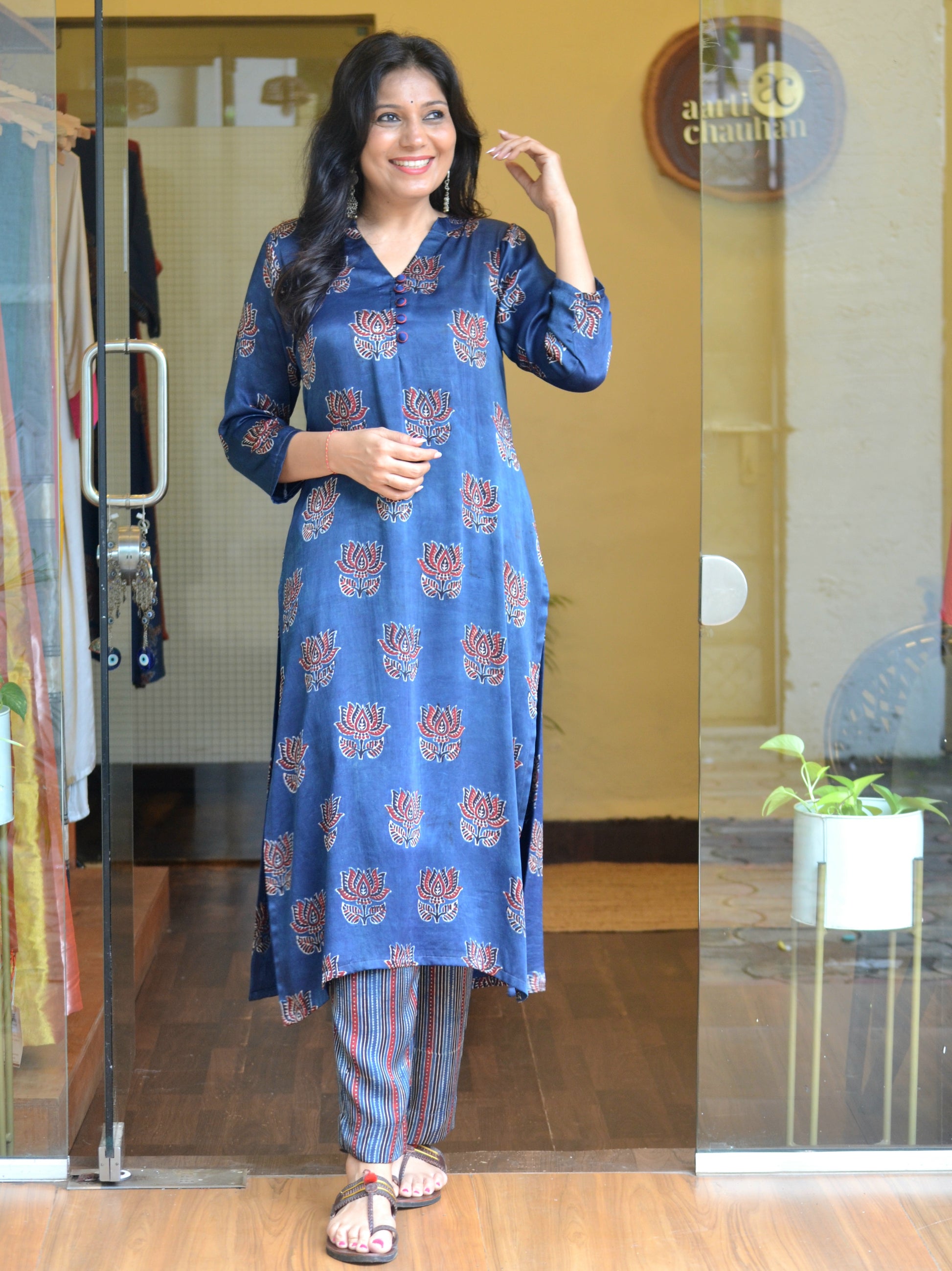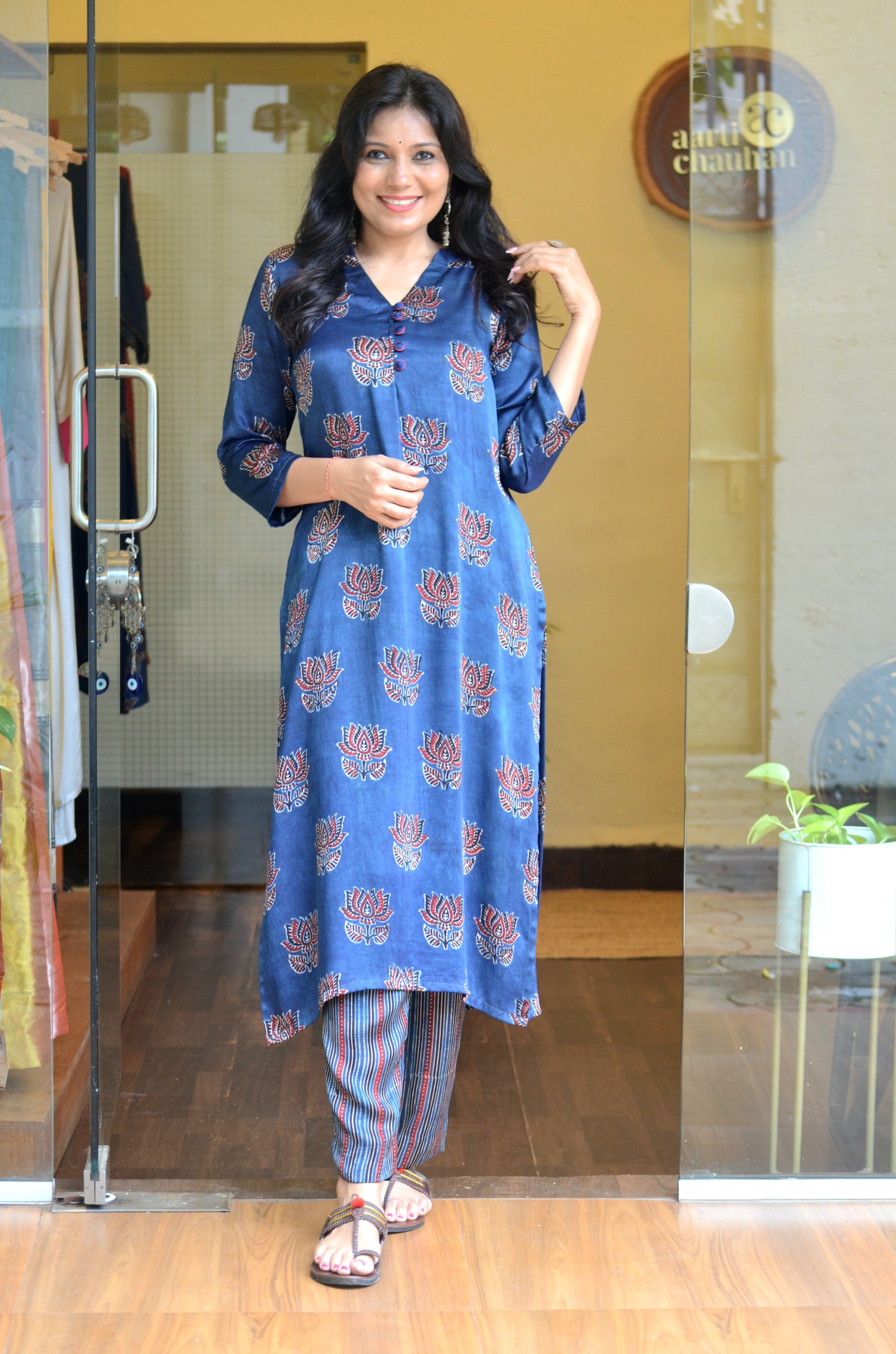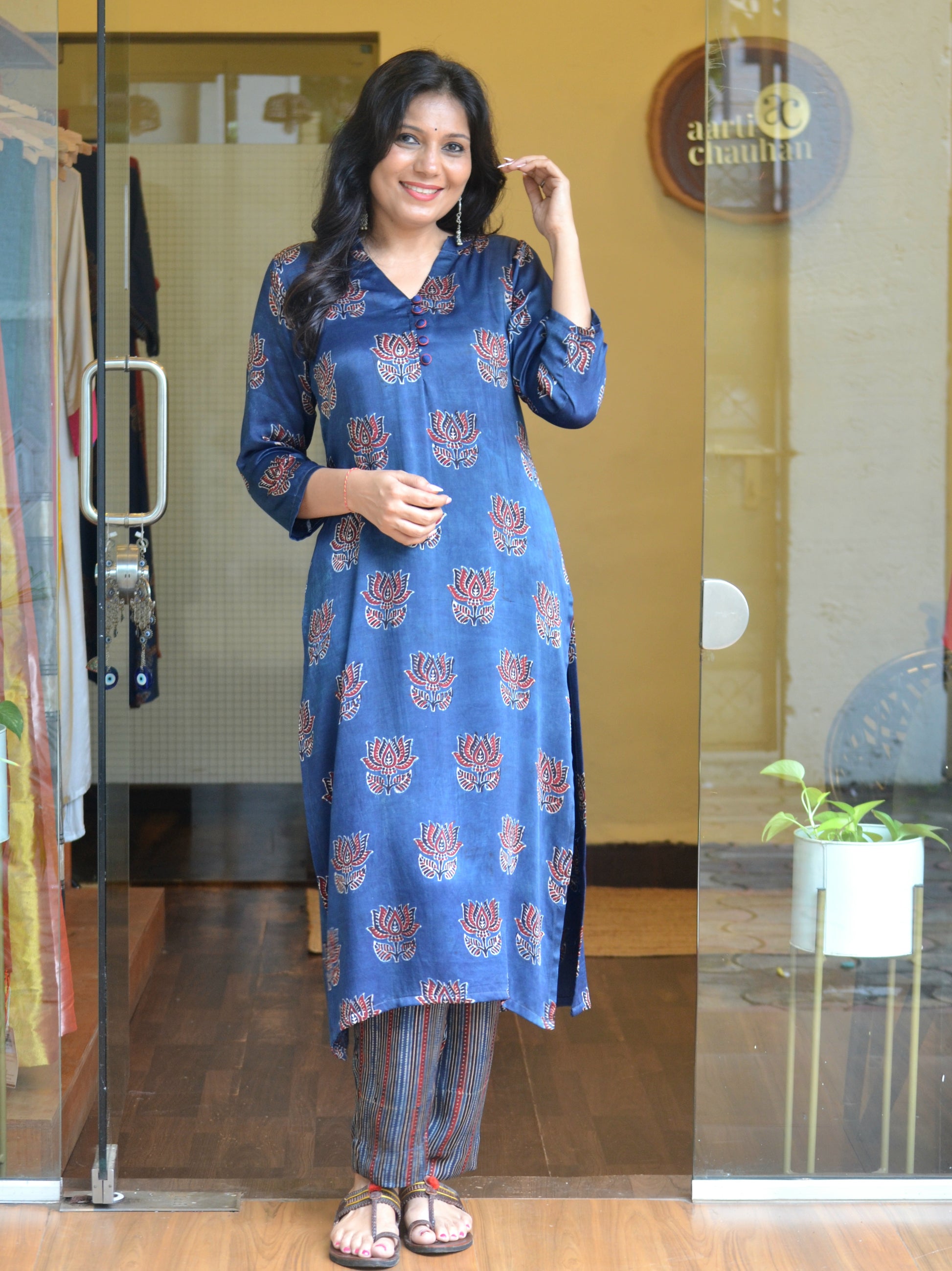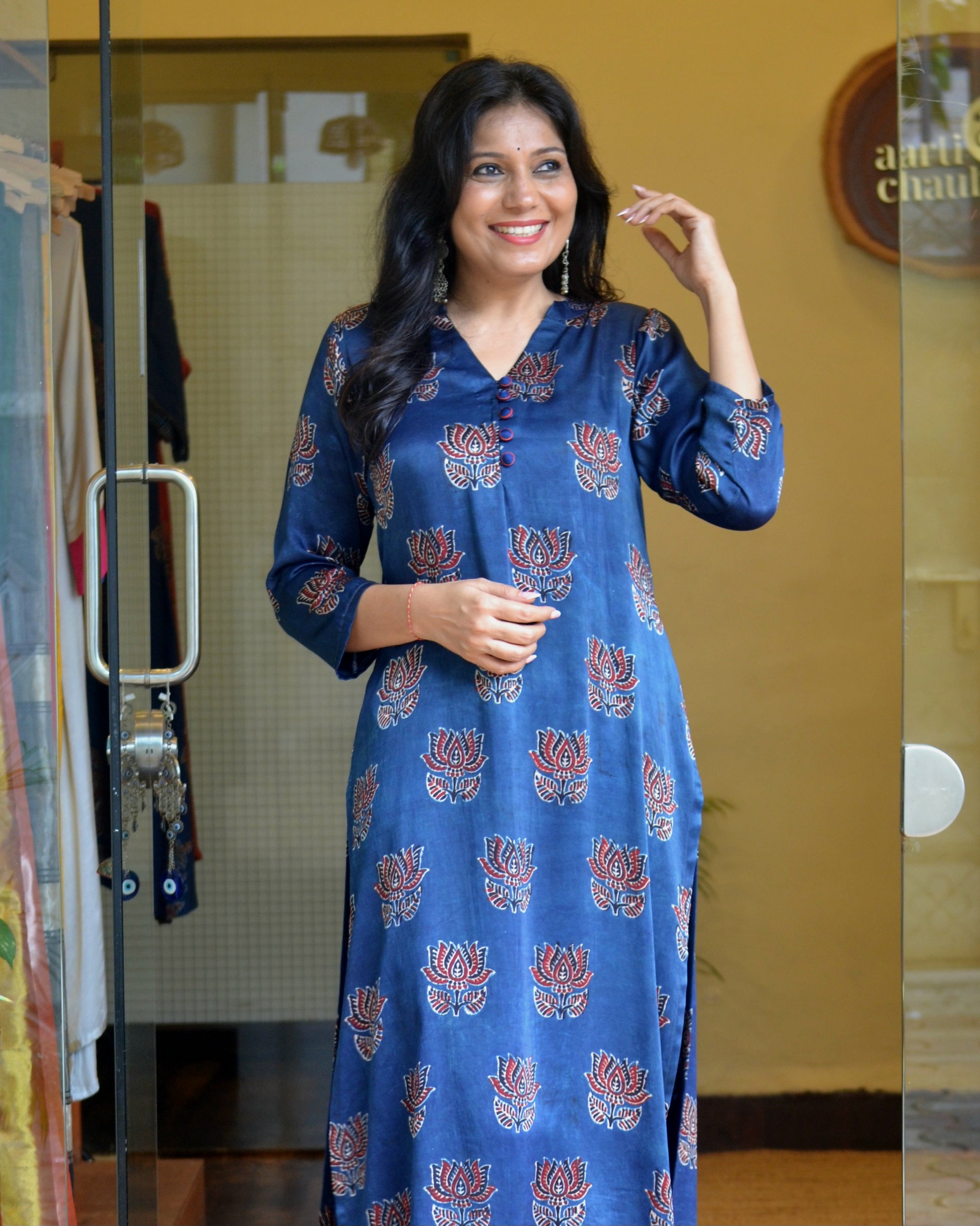 This is a modal silk kurta featuring a V-neckline with a collar. The kurta is beautifully adorned with a hand block print floral motif in contrasting shades of red and maroon over a deep indigo base, giving it a traditional yet elegant appeal. The neckline is further highlighted with fabric buttons, adding a refined handcrafted touch. Its smooth texture and flowy drape make it both comfortable and stylish, ideal for casual as well as semi-formal wear.