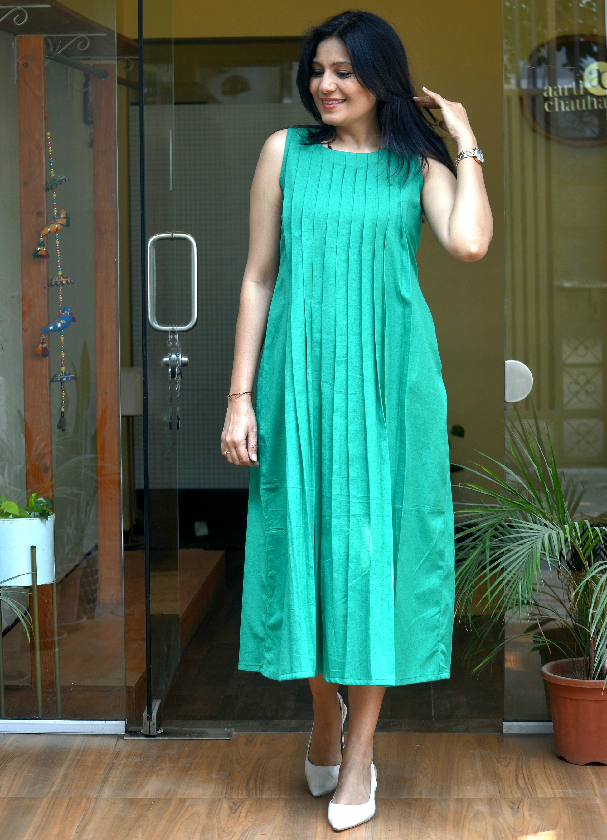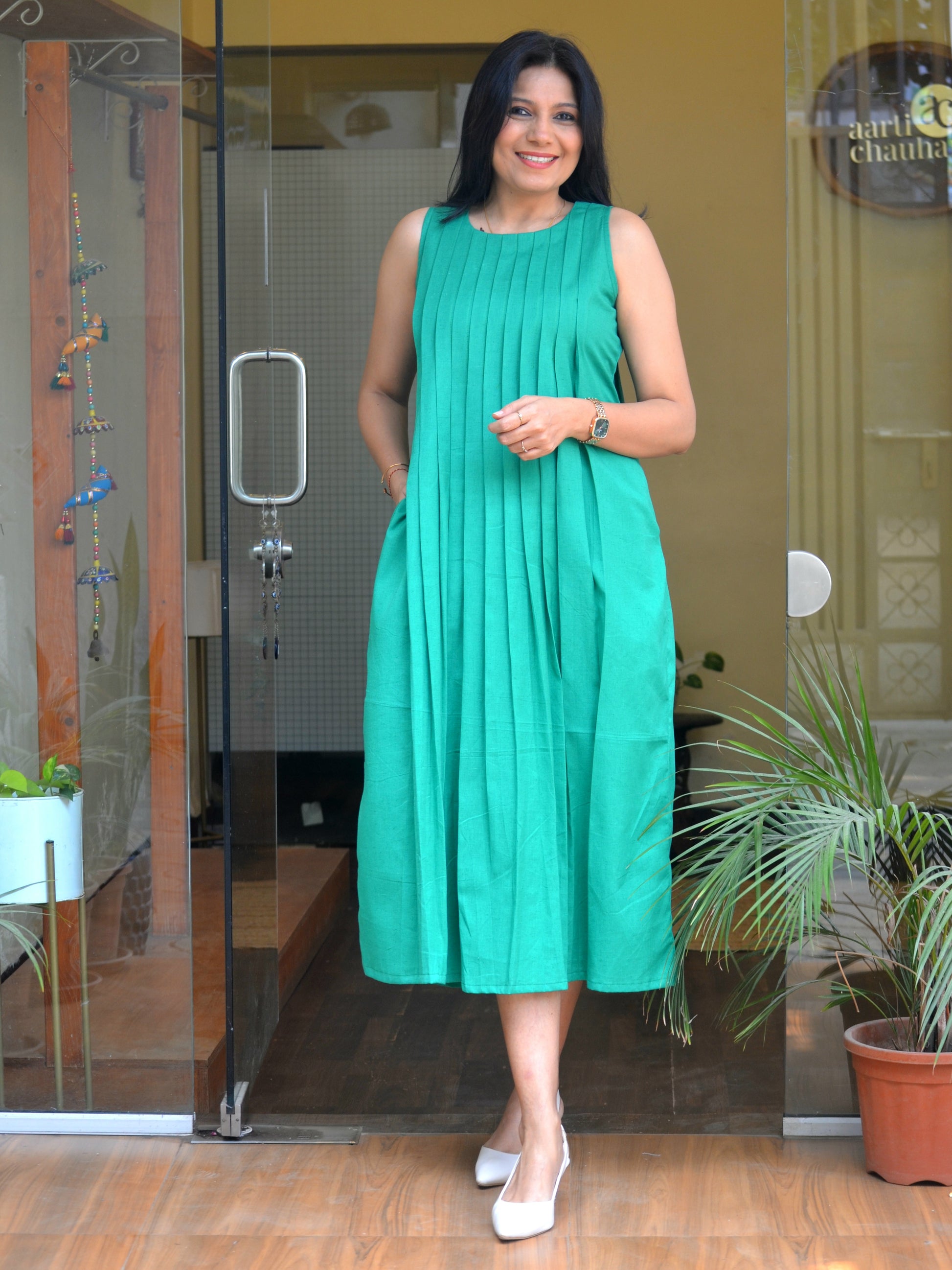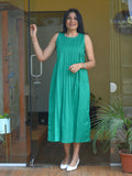 Product Description- The elegant Mint Mojito dress is rafted from soft and breathable cotton, offering all day comfort with a structural fall. Designed with a clean round neckline, the dress feature neat pleating on both the front and back that adds graceful volume and subtle texture to the silhouette. A hook-and-eye opening at the back ensures easy wear while maintaining a polished finish. Thoughtfully designed with a functional side pockets, this piece blends minimal style with everyday practically. Color: Green