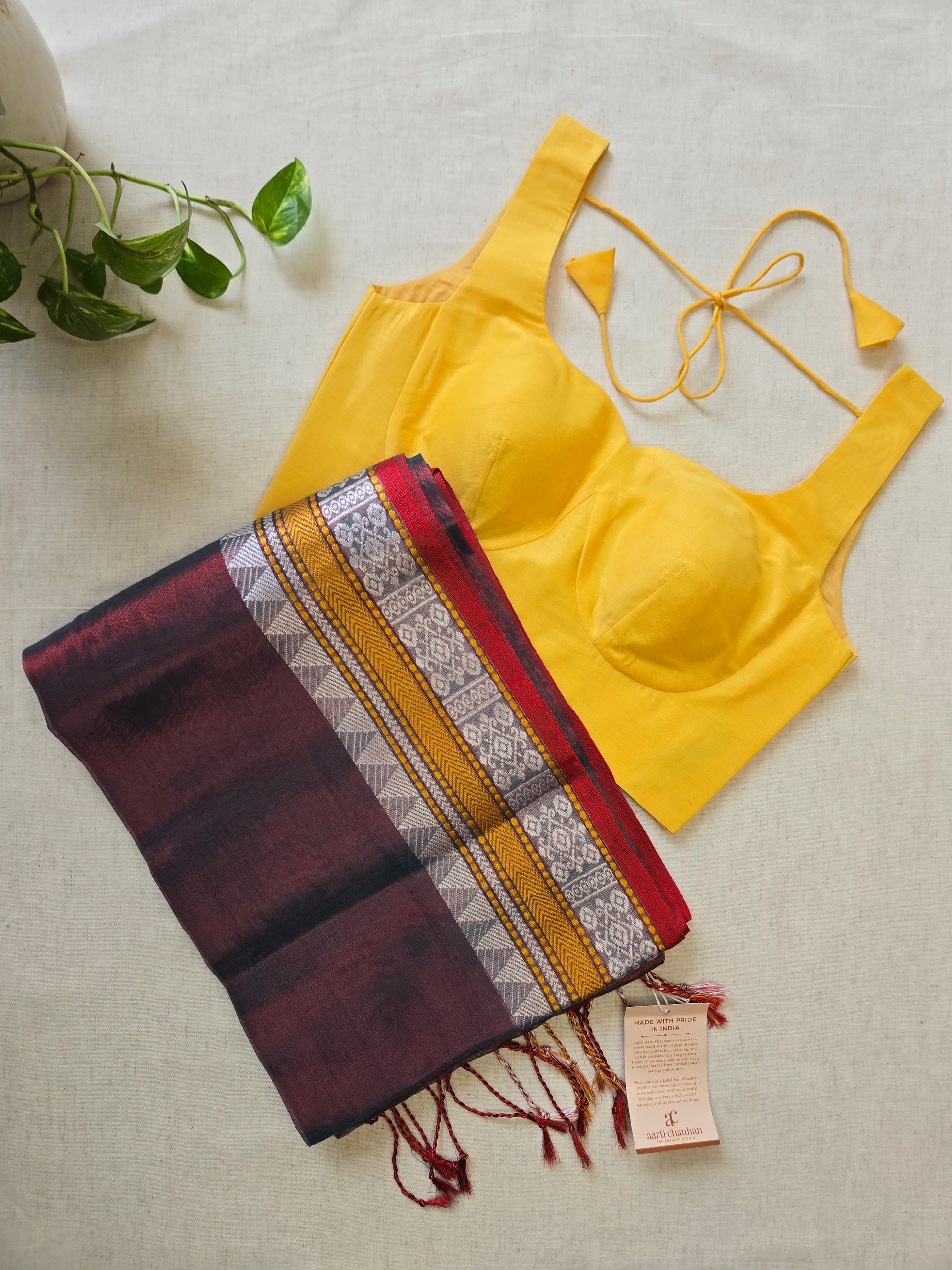 Product Description- This mul tissue saree is crafted from a breathable blend of mulmul cotton and soft tissue fabric, featuring a subtle dual-tone effect that adds depth and elegance. Lightweight and easy to drape. The border features a striking play of silver textures and mustard-gold highlight, detailed with traditional geometric and floral motifs and highlighted by a mustard-gold chevron panel, adding contrast, depth, and timeless ethnic elegance. Gentle on the skin and effortlessly graceful, the saree comes with a matching blouse piece attached. Color: Brown