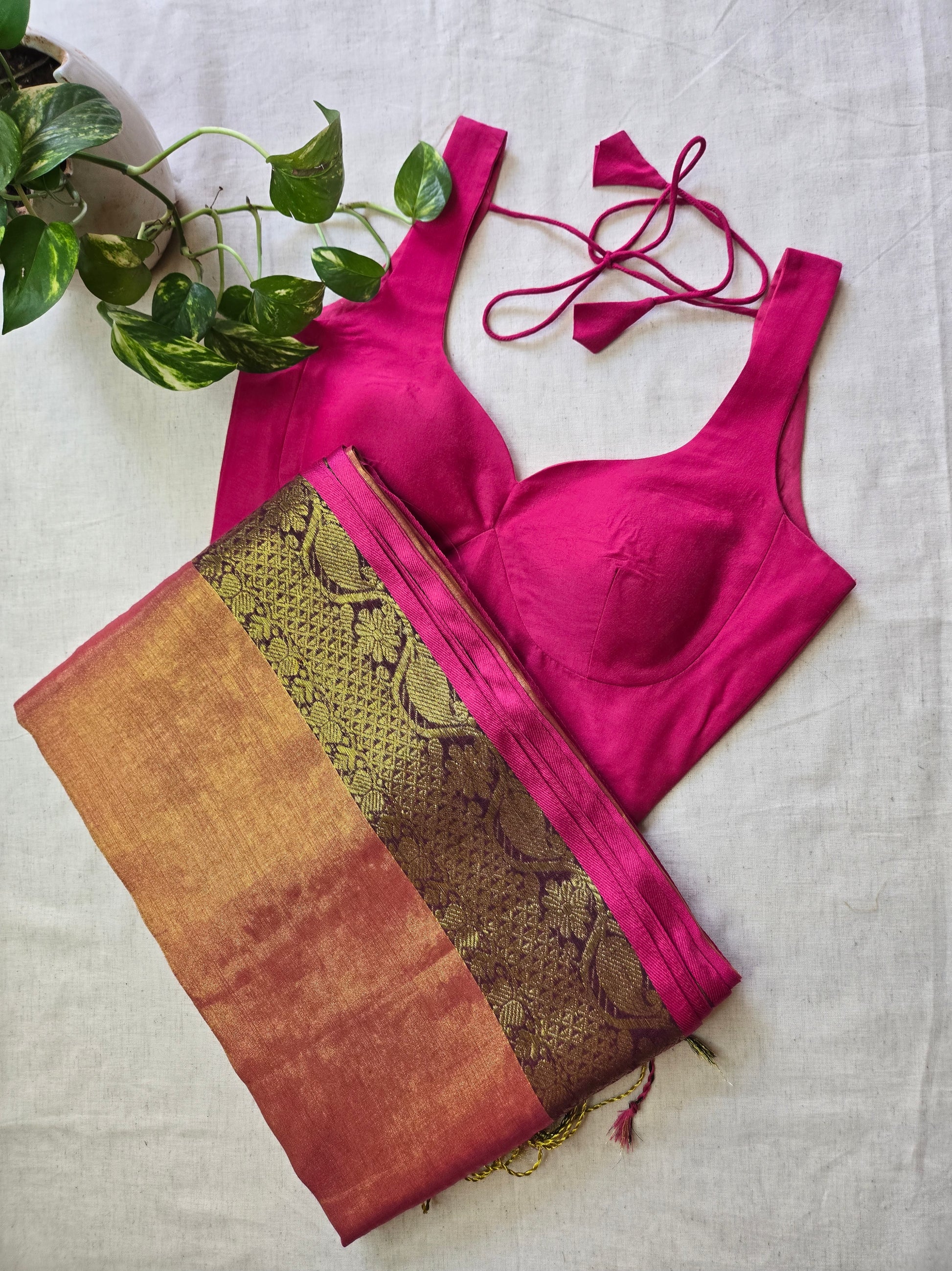This mul tissue saree is crafted from a breathable blend of mulmul cotton and soft tissue fabric, featuring a subtle dual-tone effect that adds depth and elegance. Lightweight and easy to drape. The border features a contrast highlight, detailed with traditional geometric and floral motifs and highlighted by a mustard-gold chevron panel, adding contrast, depth, and timeless ethnic elegance. Gentle on the skin and effortlessly graceful, the saree comes with a matching blouse piece attached.