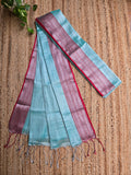 Product Description- This mul tissue saree is crafted from a breathable blend of mulmul cotton and soft tissue fabric, featuring a subtle dual-tone effect that adds depth and elegance. Lightweight and easy to drape. This border features a finely woven geometric pattern with diamond motifs running through the center, framed by textured panels on either side. Delicate triangular temple-style detailing along the edge adds a traditional rhythm, giving the border a balanced blend of structure and elegance. Gentle on the skin and effortlessly graceful, the saree comes with a matching blouse piece attached. Color: Sky Blue
