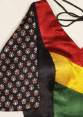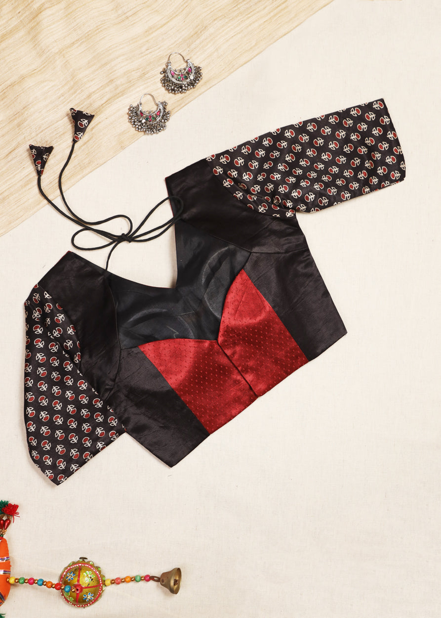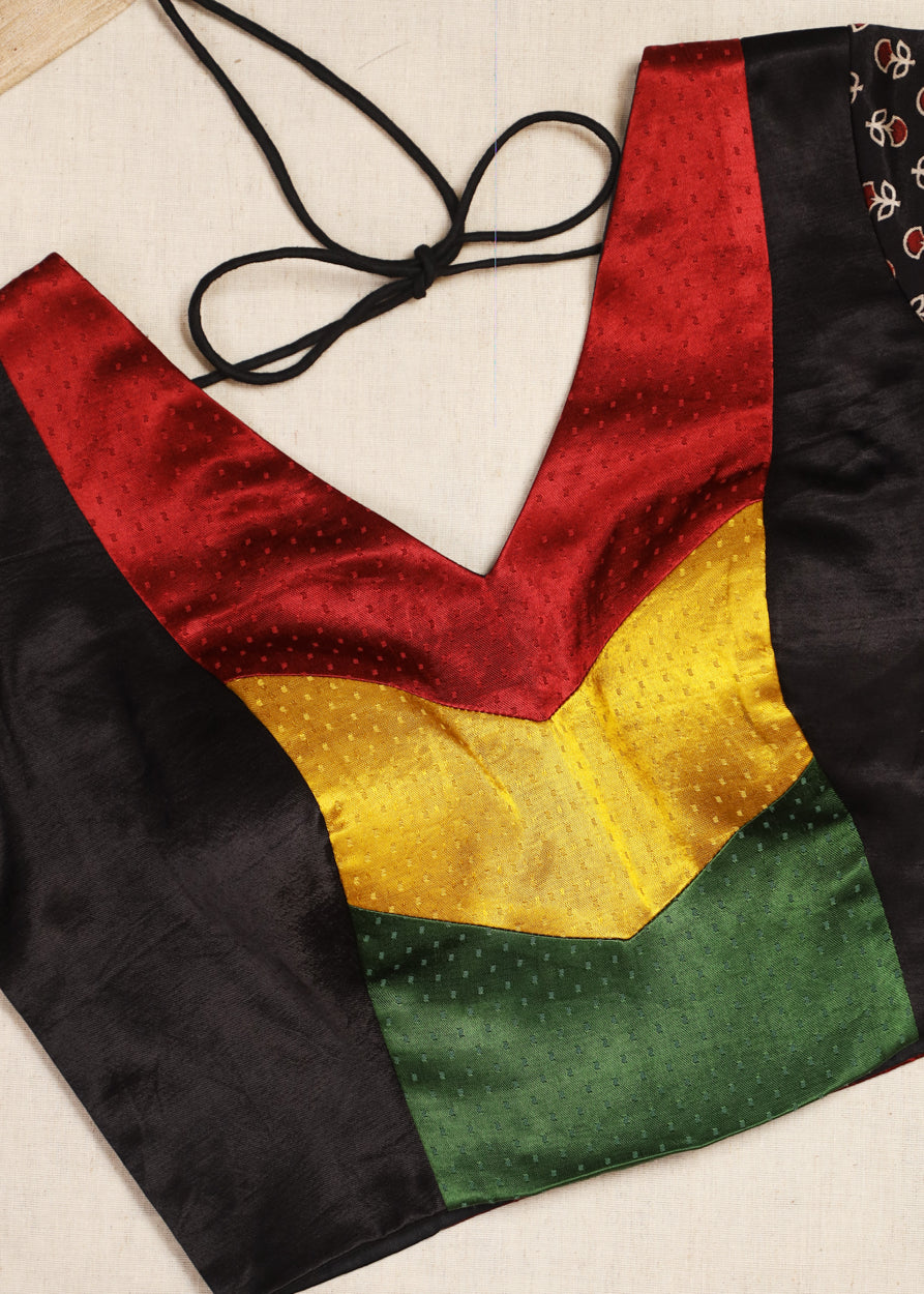 This elegant blouse is designed in luxurious elaicho fabric with a bold and festive appeal. The front features a vibrant patchwork panel in red, yellow, and green hues, creating a striking contrast against the deep black base. The blouse is padded for comfort and perfect fit, ensuring both style and ease of wear. The sleeves are made from ajrakh printed fabric, adding a touch of traditional artistry and elevating the overall look with a heritage vibe. At the back, the blouse showcases a deep cut with back-open style, finished with a dori tie-up, making it adjustable and stylish at the same time. Perfectly blending modern cuts with traditional crafts, this blouse is an ideal choice to pair with festive lehengas or sarees for festive nights.
