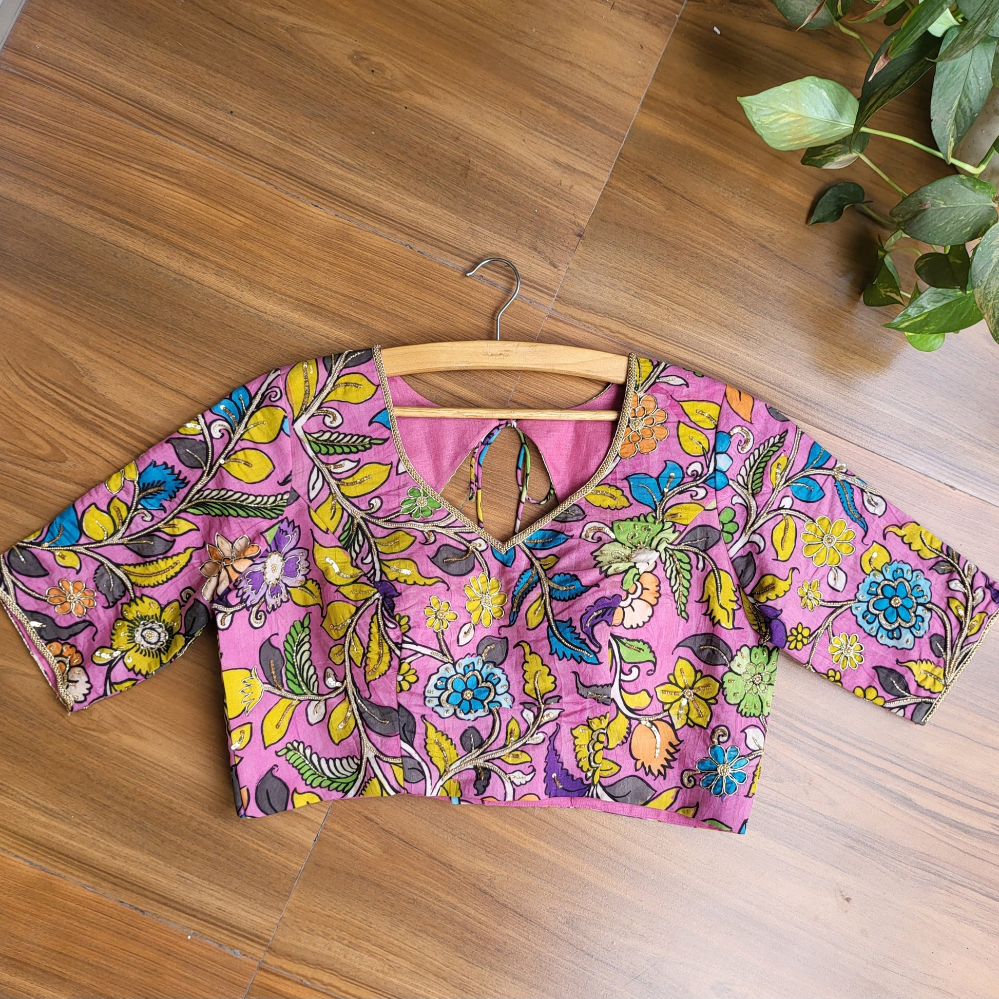 Hand painted kalamkari blouse with classic and elegant hand embroidery .Bangalore Silk fabric will give both comfort and richness. Blouse is lined with pure cotton lining and pads. Article is having 1.5 inches margins on both sides. Color may look slightly different in real than photos due to digital photography. Dry clean preferred.