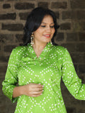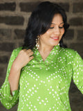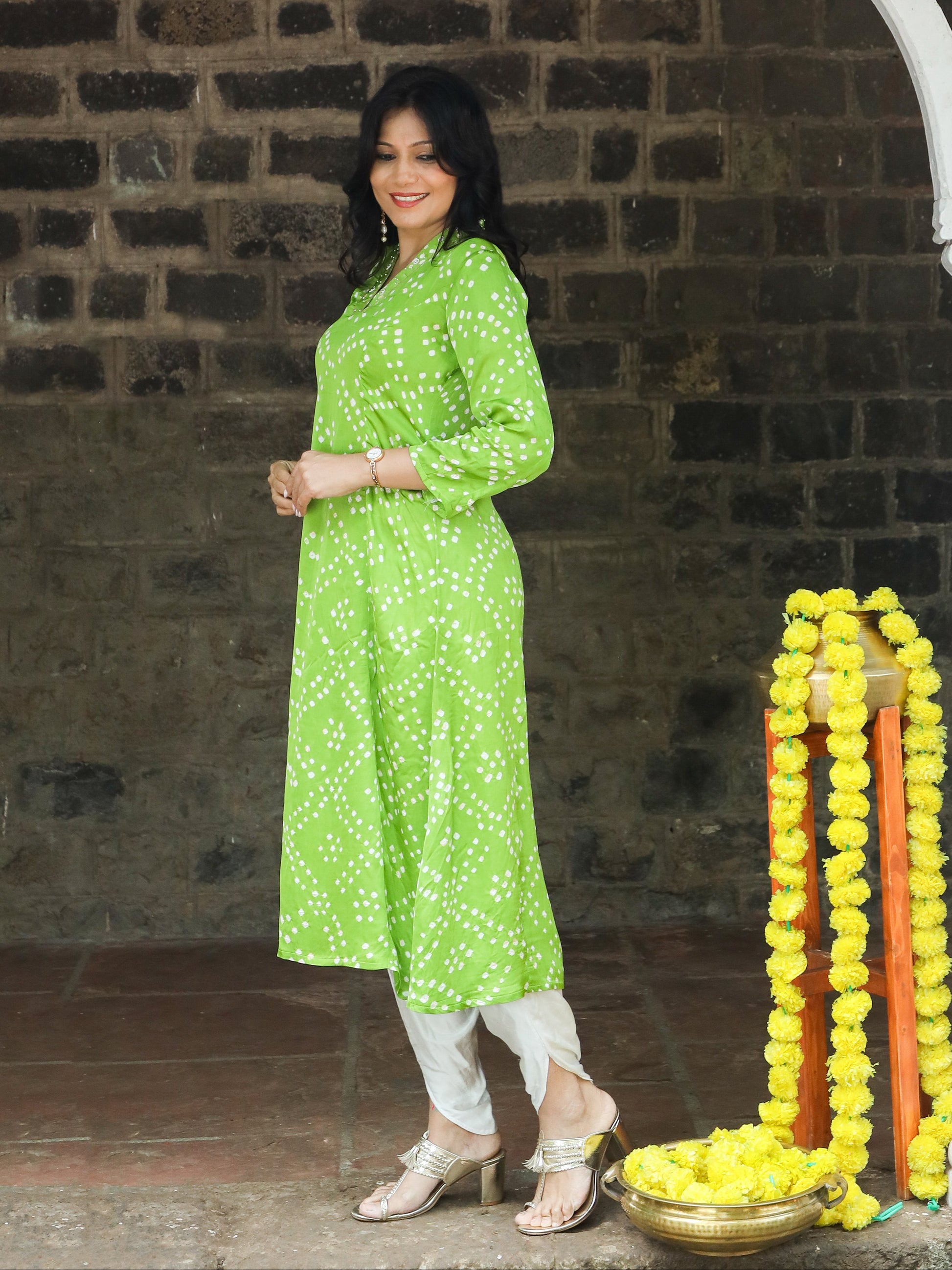 This graceful handcrafted Bandhani kurti, made from smooth modal silk, reflects a perfect blend of tradition and elegance. The hand-crafted patterns add an artisanal charm, while the front keyhole with a pearl button gives it a refined finish. Style it with a matching colour pant or a chic tulip pant to complete the look with a modern twist. This kurta is perfect for semi-casual and festive occasions.
