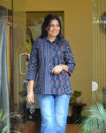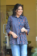This handcrafted shirt in deep indigo features traditional Ajrakh hand-block prints accented with rust, beige, and muted blue tones. Mixed panels of striped Ajrakh and delicate floral butti create a balanced, distinctive look that flows seamlessly to the back. Finished with contrast-printed 3/4th sleeves, rust-red piping at the cuffs, a structured collar, and natural wooden buttons, it beautifully blends heritage craftsmanship with contemporary style.