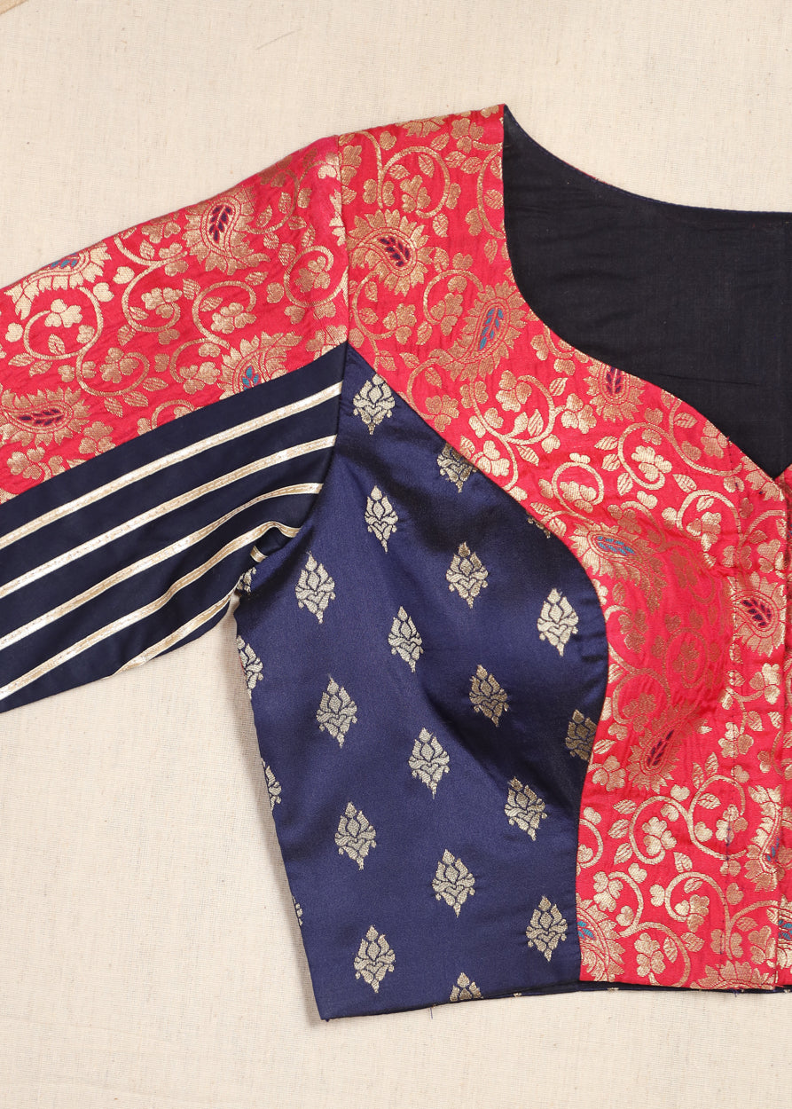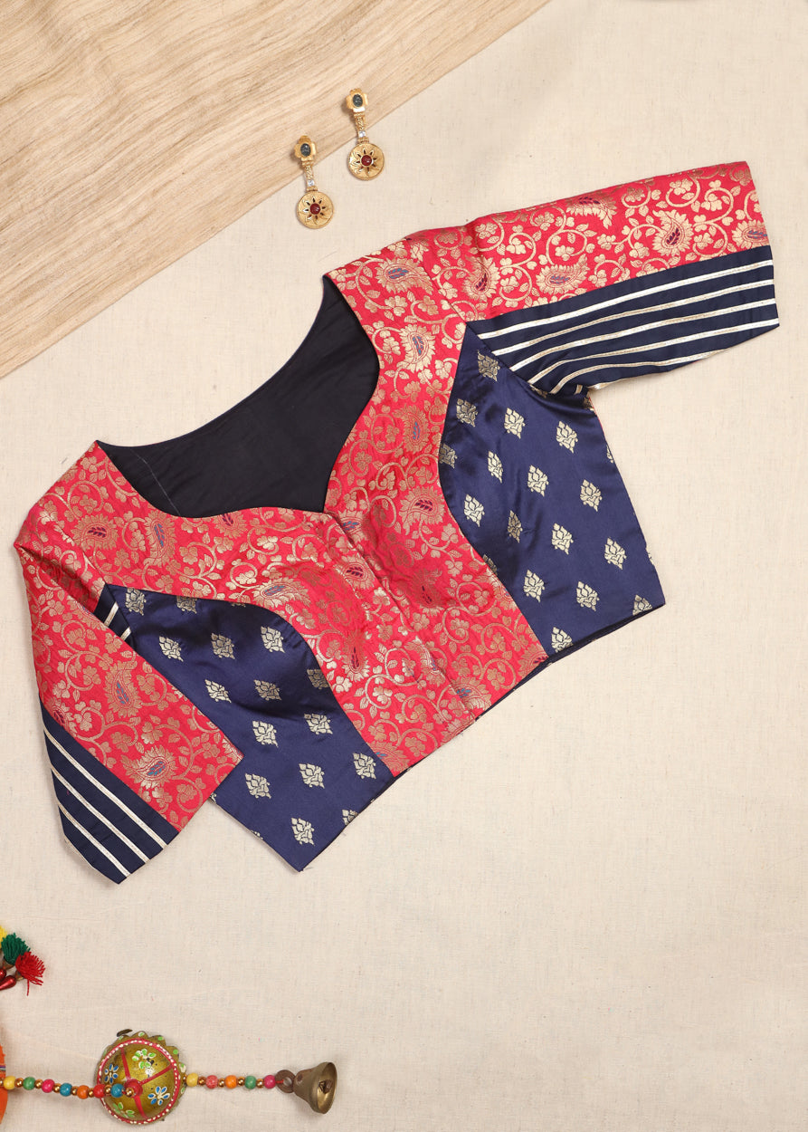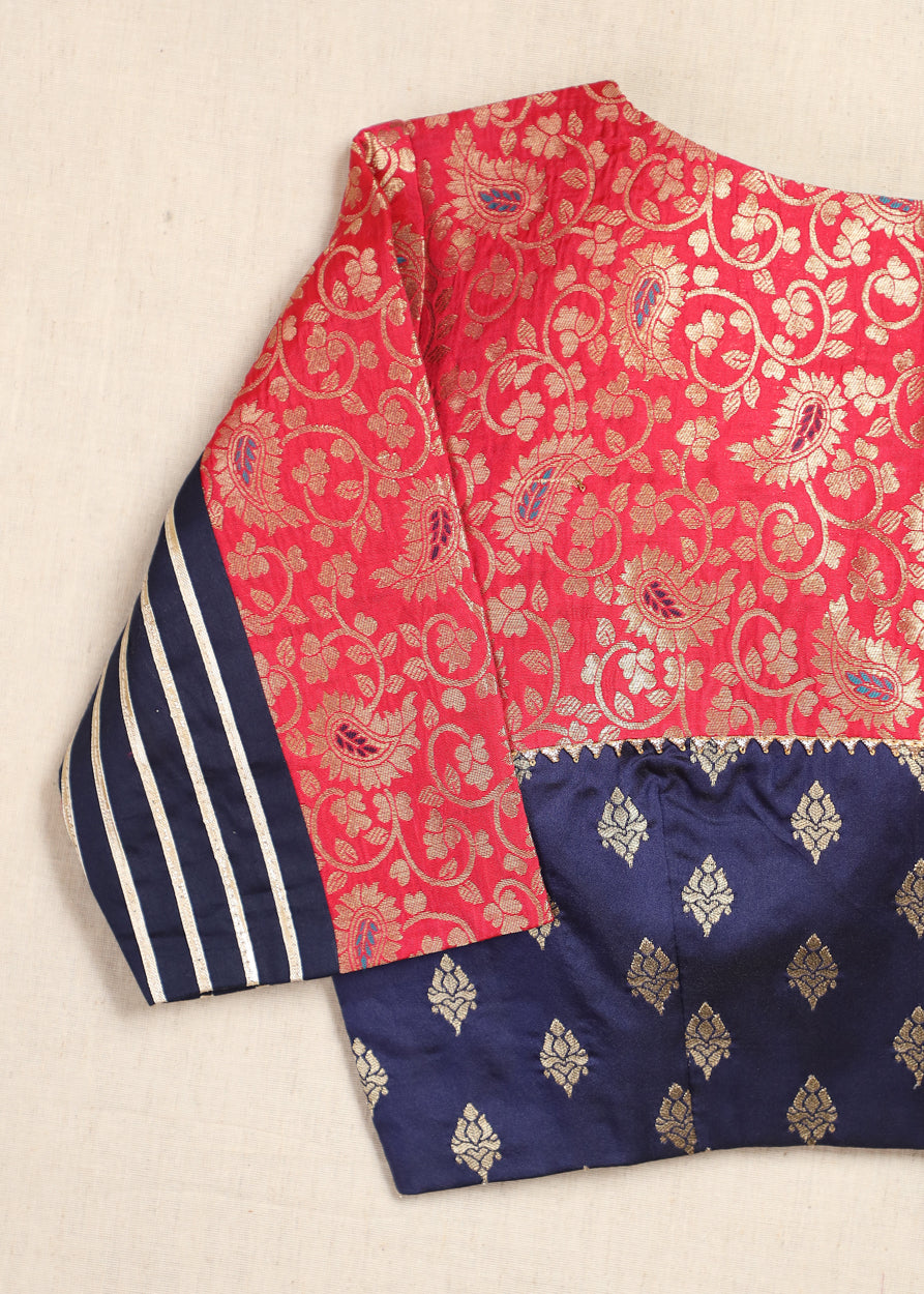 A perfect blend of tradition and modernity, the Shivani blouse is crafted with luxurious brocade and silk, adorned with delicate gota accents. The stunning duo of pink and blue makes it a versatile piece for festive sarees, lehengas, or even mix-and-match styling. Tailored to perfection, Shivani ensures a flattering fit with timeless elegance, making it a must-have for your festive and wedding wardrobe.