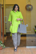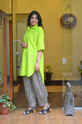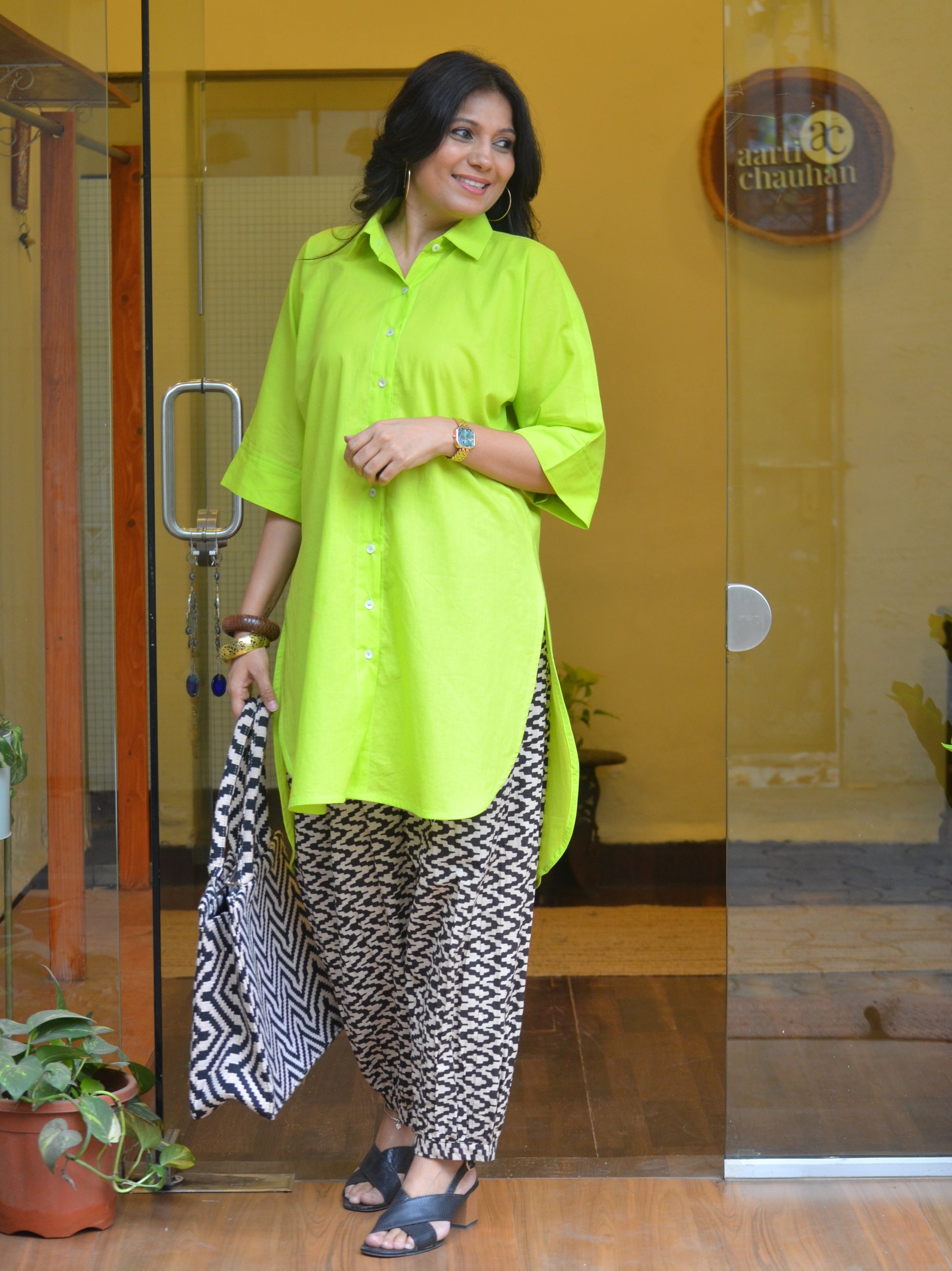 This mul cotton shirt dress is designed for effortless comfort and everyday elegance. Crafted in breathable, lightweight fabric, it features a relaxed comfort fit that drapes beautifully on the body. The classic shirt designed with a stylish high-low hemline, it offers a modern silhouette while ensuring ease of movement. A perfect blend of tradition with a contemporary twist, this shirt dress pairs beautifully with monochrome lantern pants for an elegant, modern look.