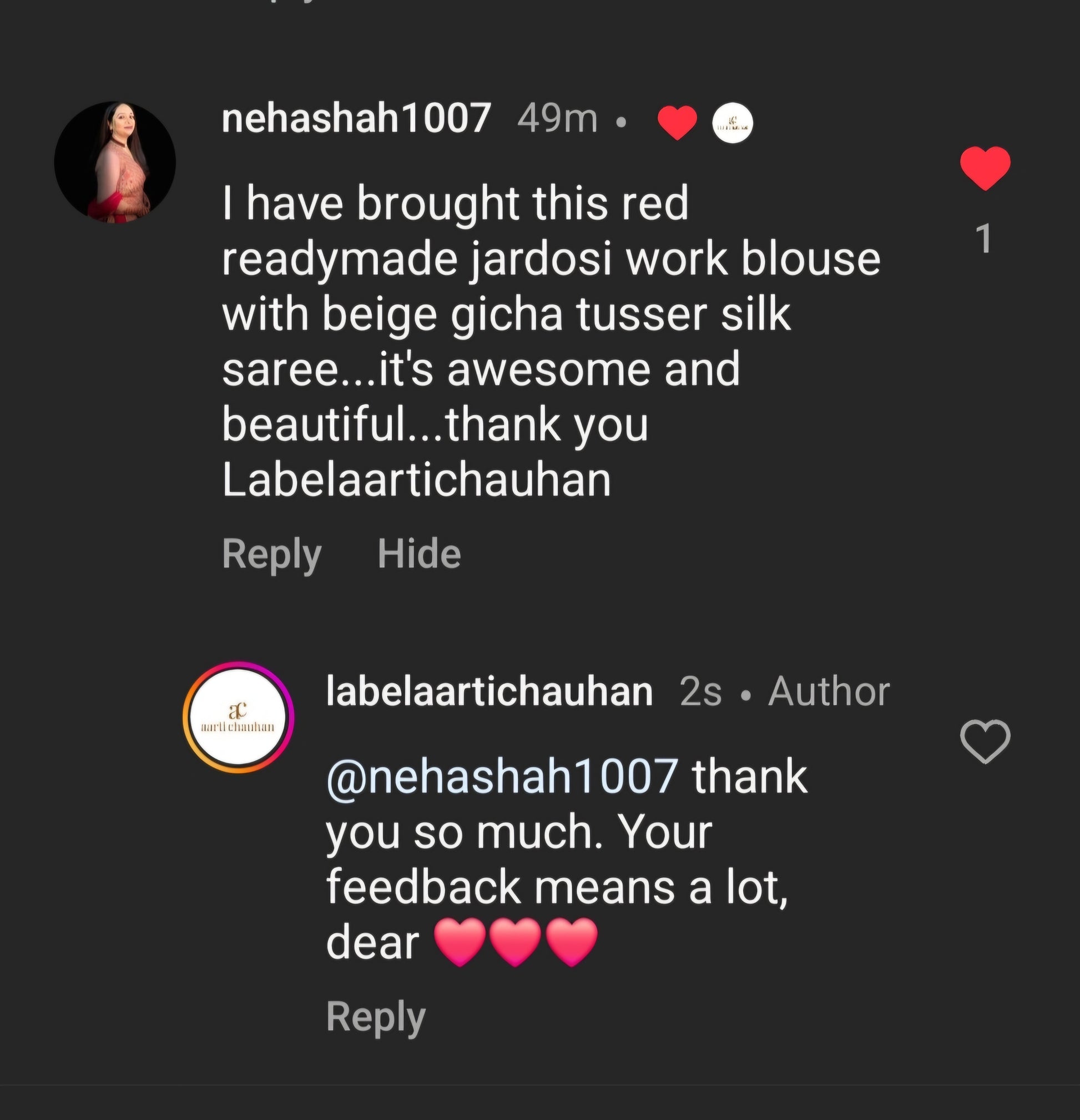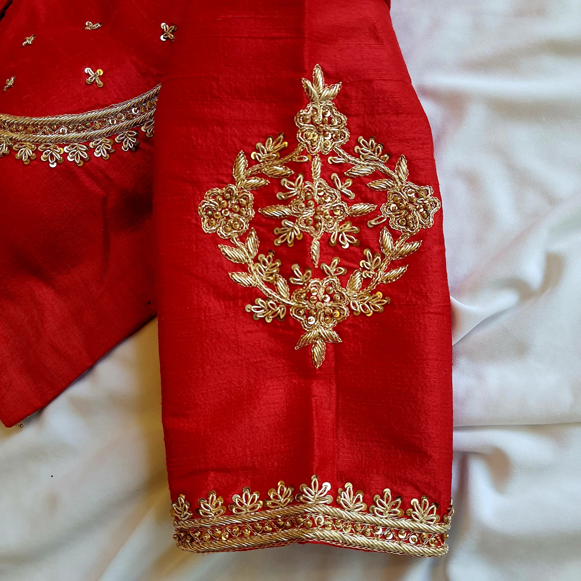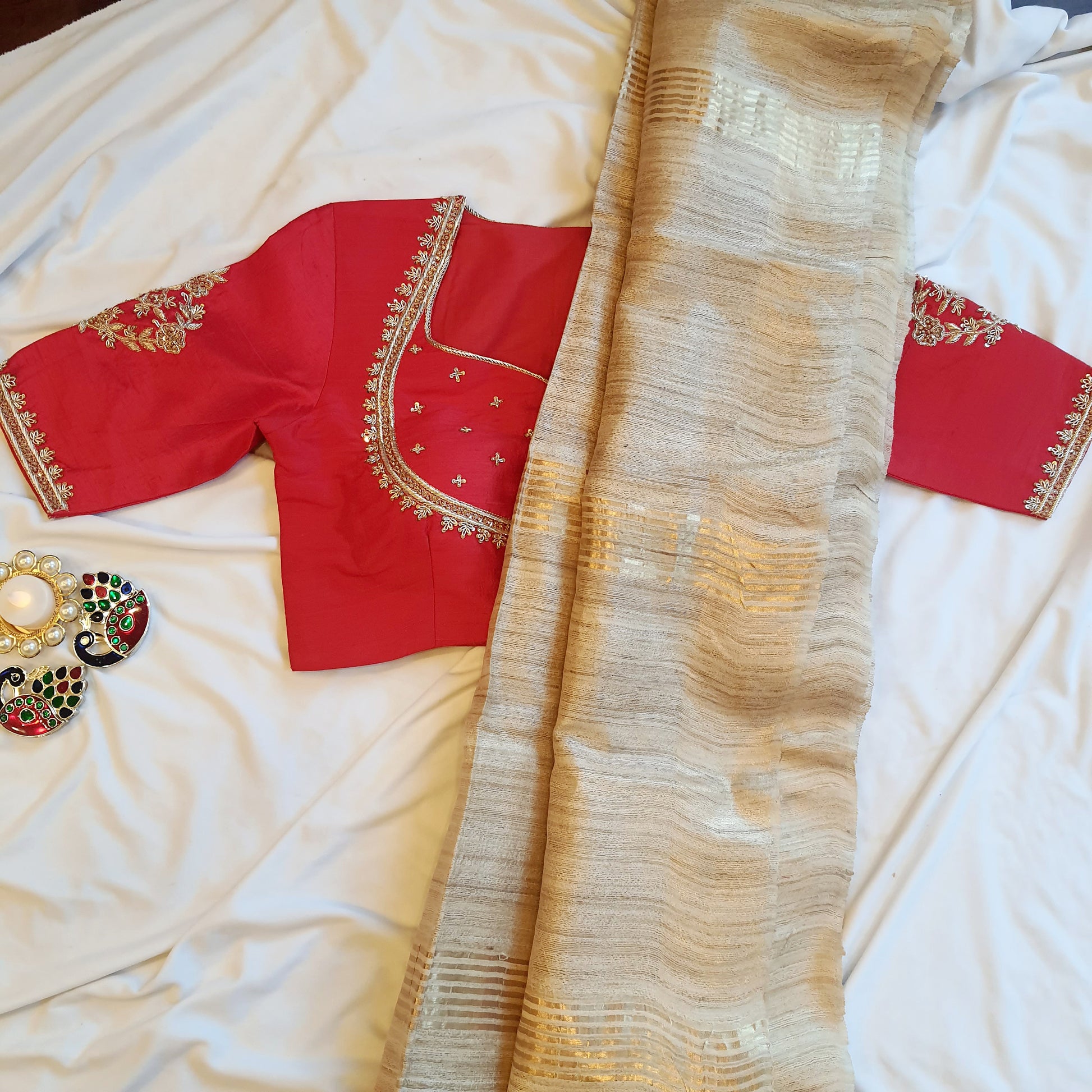 Exclusively hand embroidered blouses are made from pure handwoven raw silk fabrics and stitched with cotton lining and pads. Margins are given in all articles.