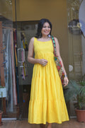 Product Description- This sunflower-inspired mul dress is designed in a soft 3 layer silhouette that flows into a graceful full ghera. Crafted from dyed mul fabric with a comfortable mul lining, it feels light, airy, and perfect for warm days. The clean sleeveless neckline is thoughtfully shaped to be ideal for wearing with a strapless bra, offering ease and confidence while maintaining a minimal, elegant look. Perfect for outings like brunches, vacations. Its breezy silhouette and cheerful tone make it ideal for warm days when you want effortless comfort with a joyful, sunlit vibe.