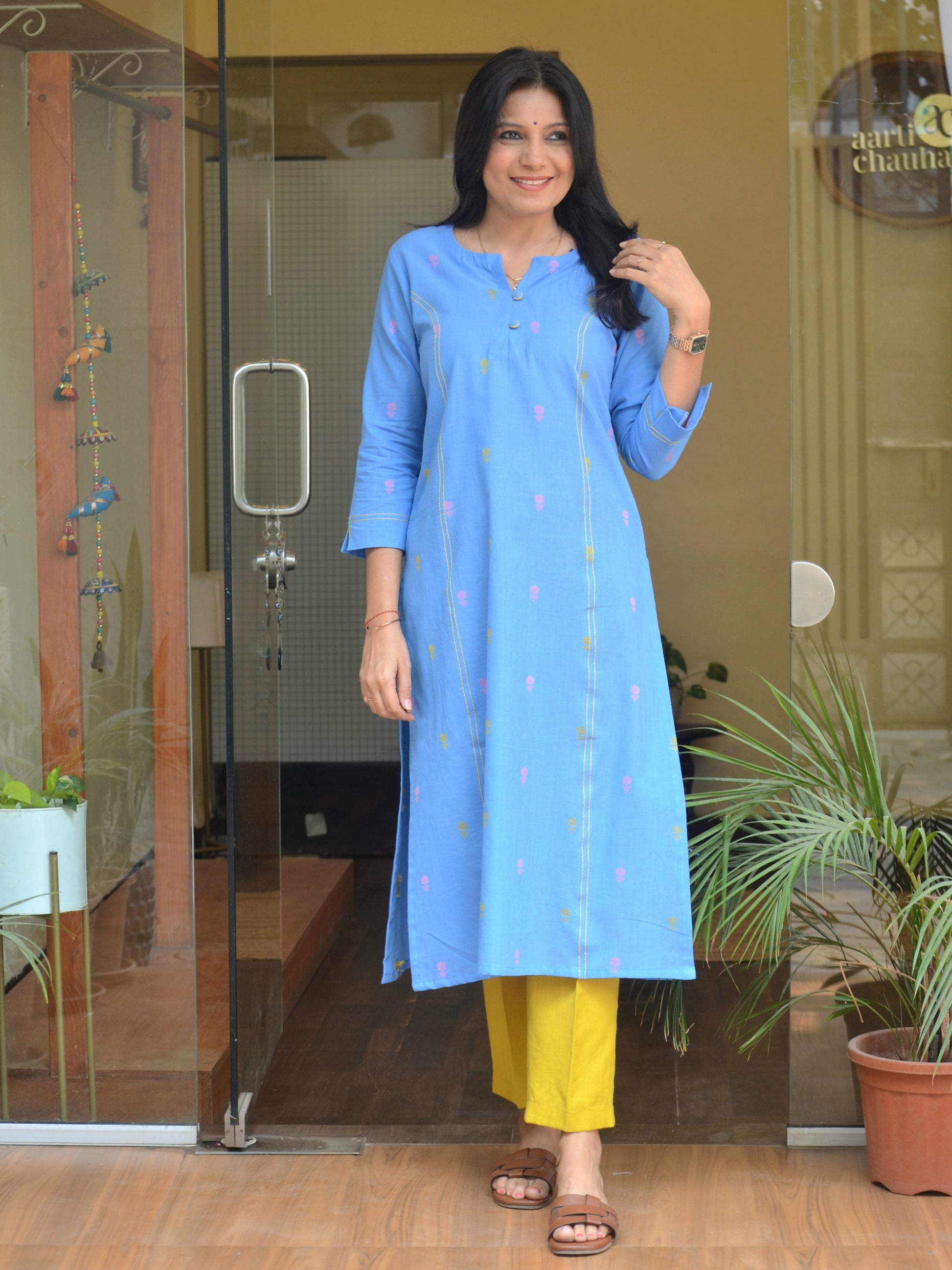Product Description- This elegant blue kurti is crafted from soft south cotton with delicate Jamdani buttas, offering breathable comfort and everyday grace. Designed with a princess line silhouette, it features fine machine katha work detailing, fabric buttons on the front placket, and 3/4th sleeves finished with cuff highlights for a refined look. Perfect for casual outings, office meetings, pujas, and relaxed family get-togethers easy, elegant, and comfortable all day long.