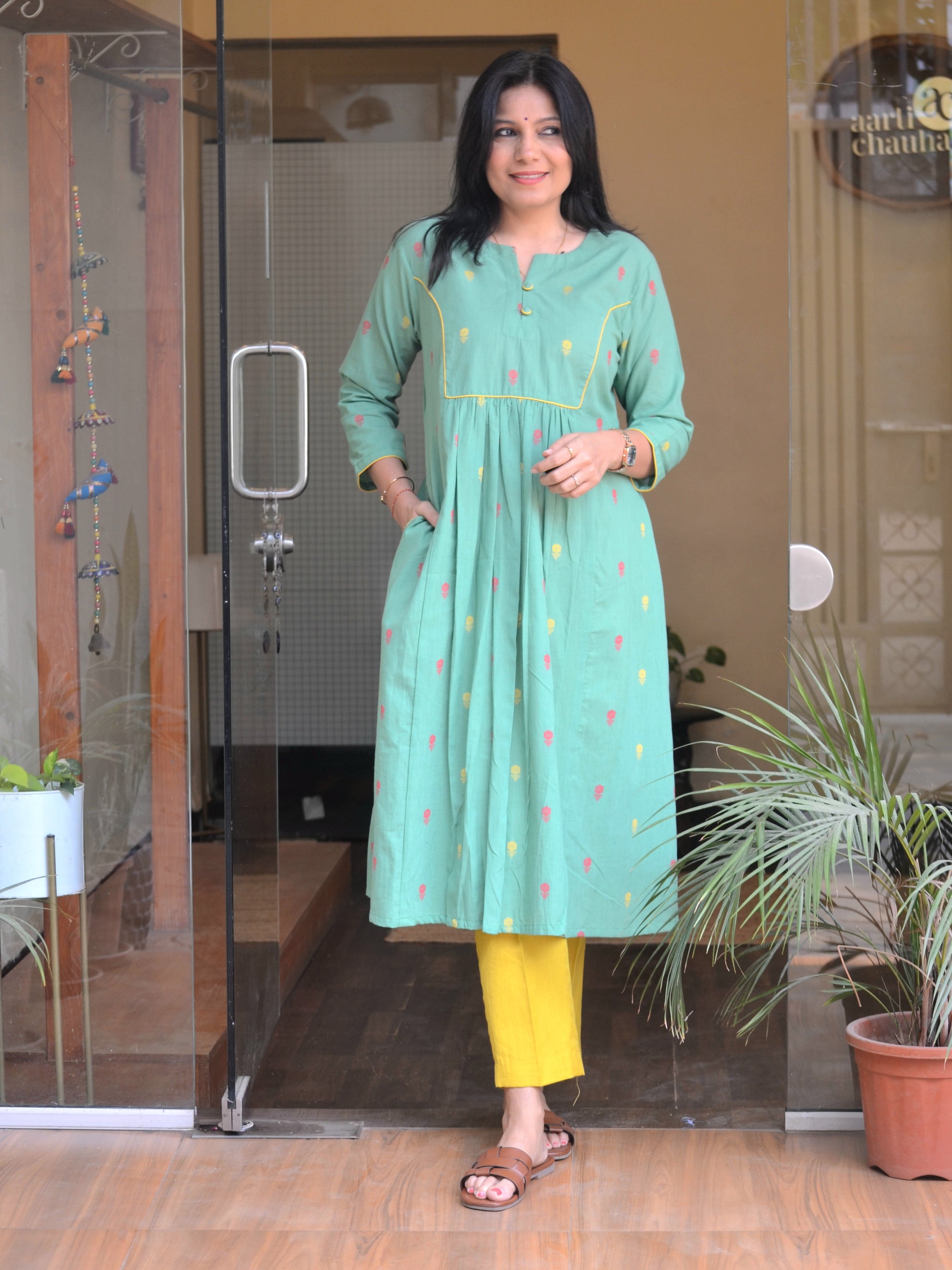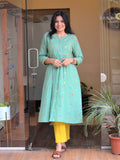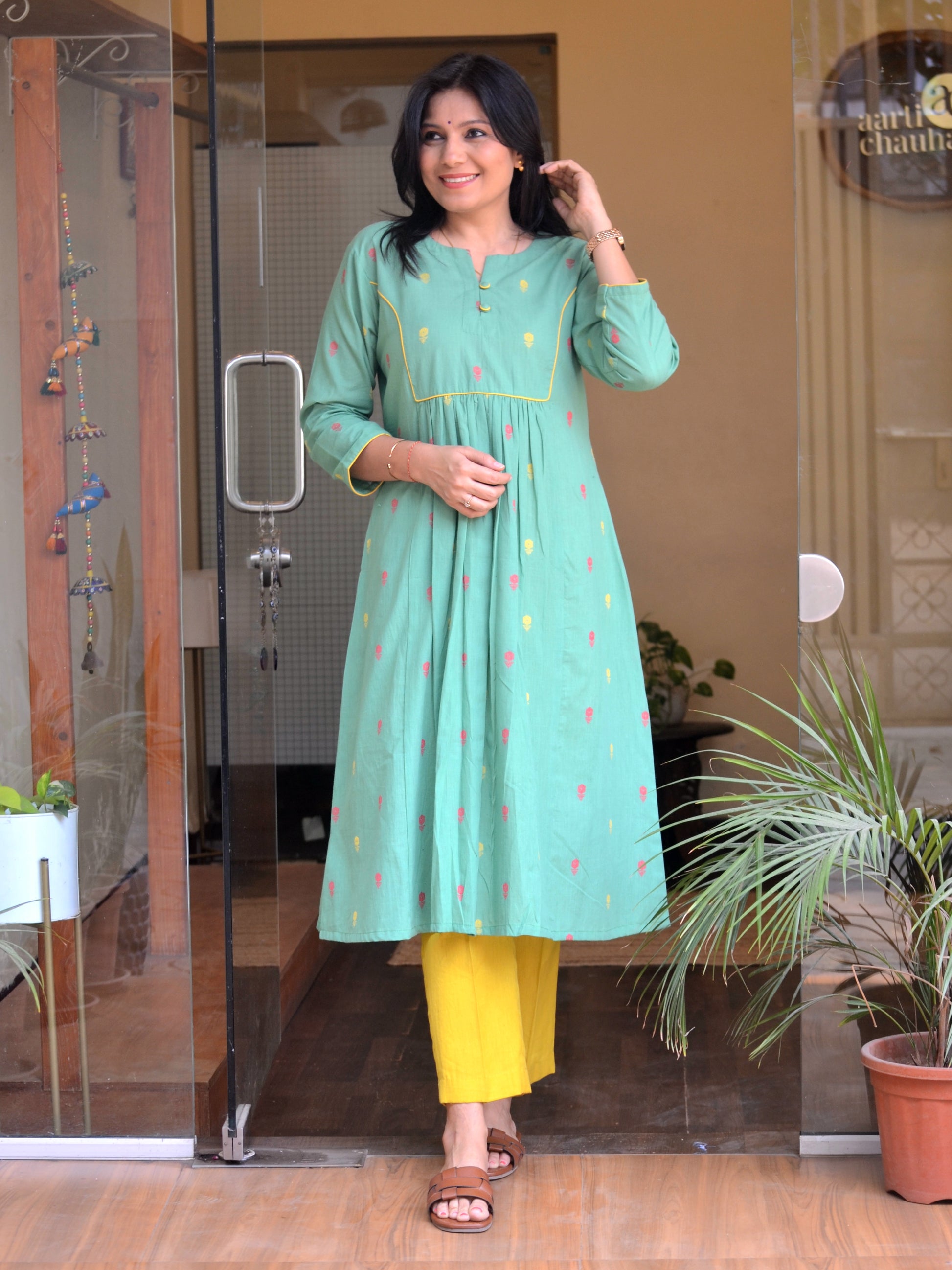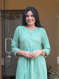 Product Description- This green kurti is crafted from soft South cotton with delicate Jamdani-inspired buttas, offering breathable comfort and a graceful fall. Designed with an empire princess line and gentle gathers, it features a minimal button placket and 3/4th sleeves for effortless everyday elegance. Color- Green