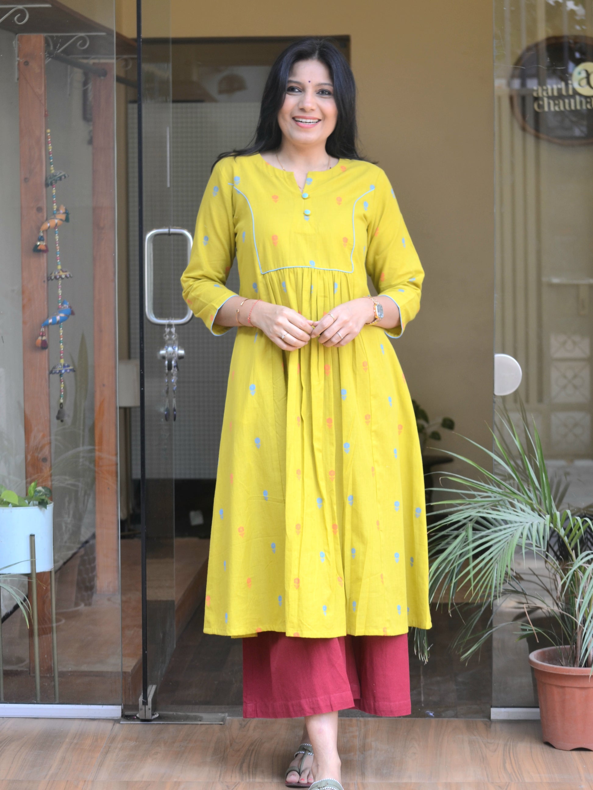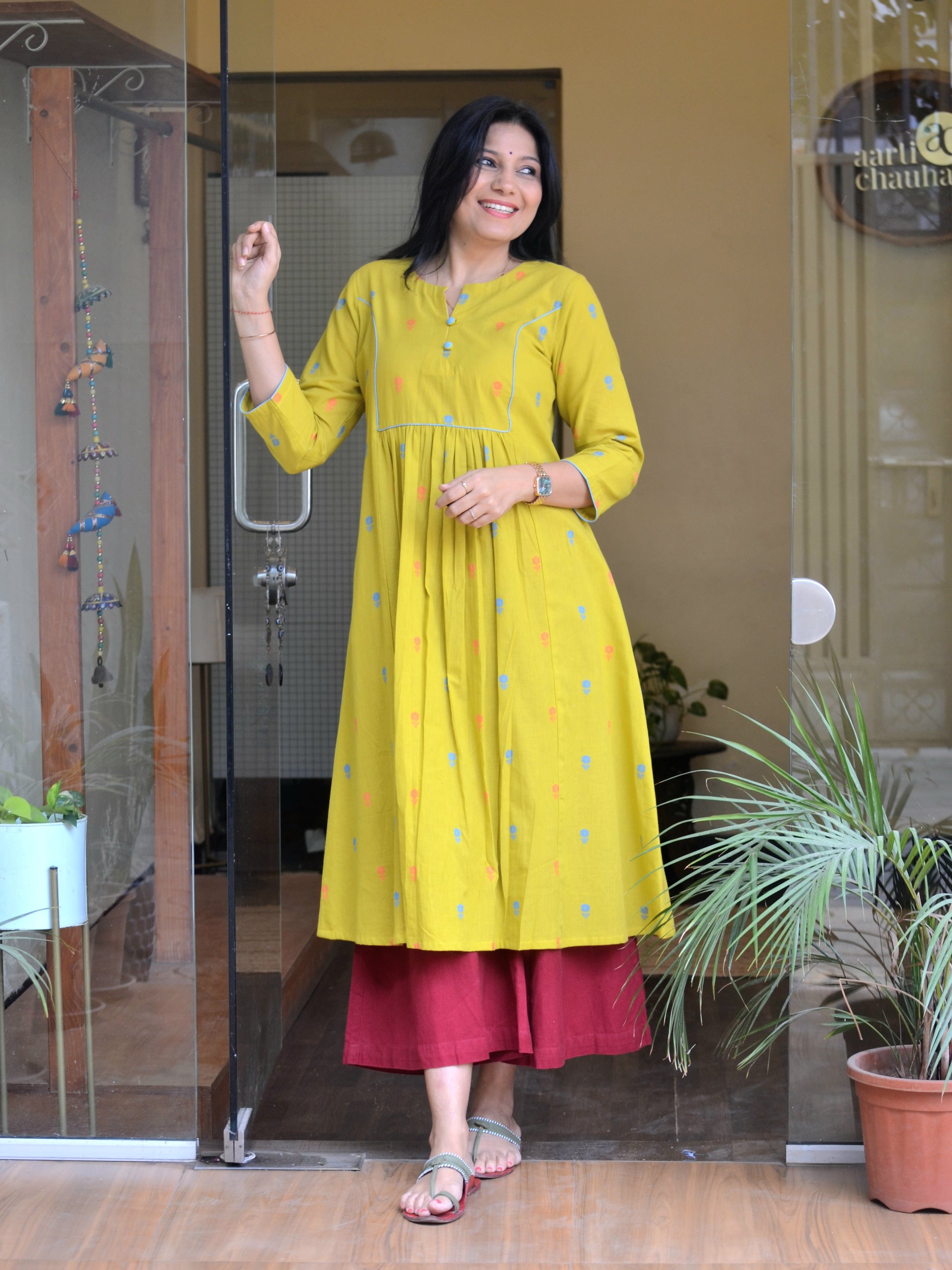 Product Description- This mustard yellow kurti is crafted from soft South cotton with delicate Jamdani-inspired buttas, offering breathable comfort and a graceful fall. Designed with an empire princess line and gentle gathers, it features a minimal fabric button placket and 3/4th sleeves for effortless everyday elegance.