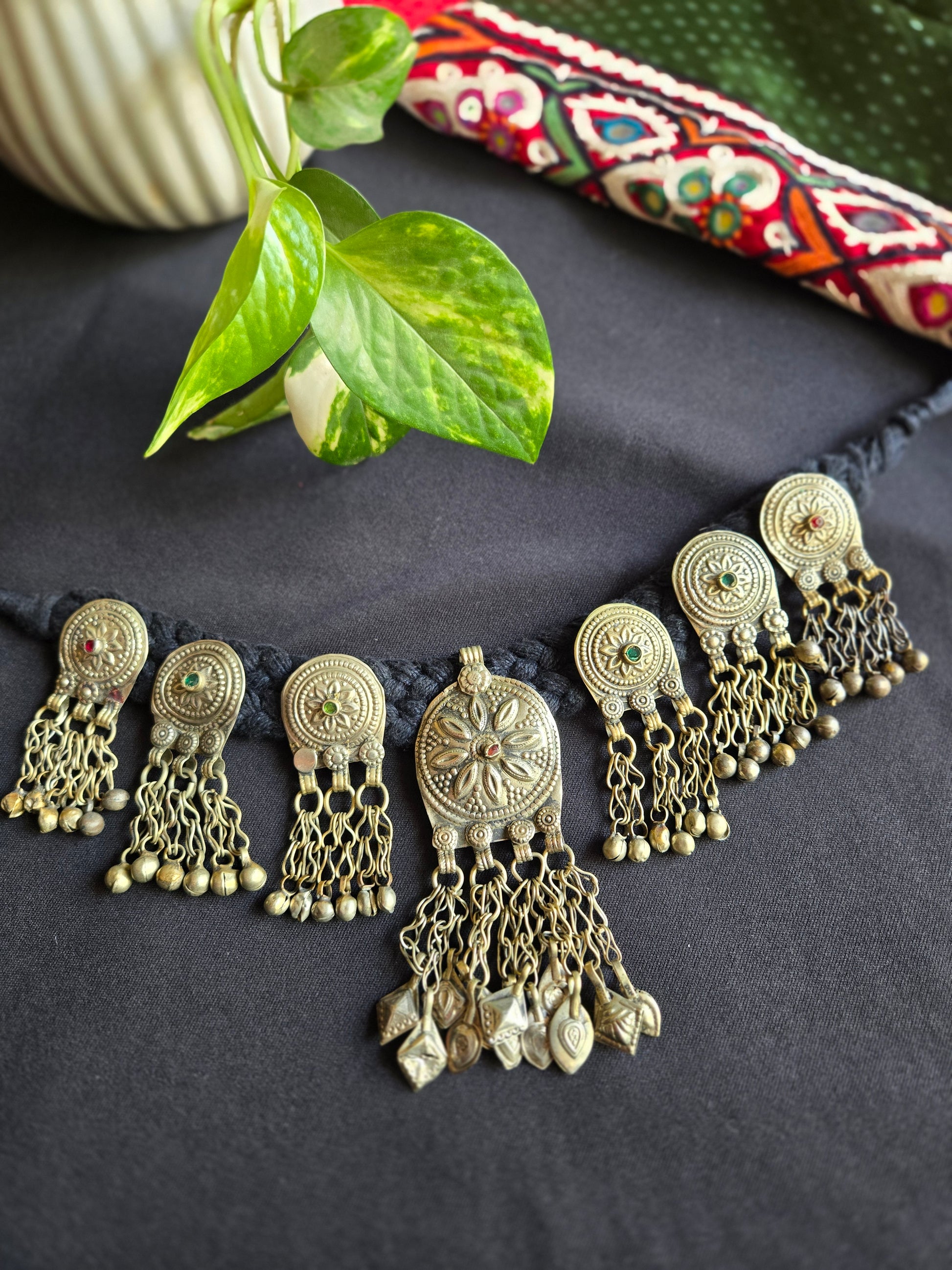 This vintage Afghani Chokar crafted with a black braided threads base adorned with antique silver tone circular pendants, each engraved with floral detail with small colored stones. Dangling chains with tiny bells and add traditional charm.