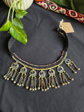This vintage Afghani Chokar crafted with a black braided threads, featuring small red and white beads along the edges. It is decorated with antique silver tone pendants featuring purple stone and multiple dangling silver bells showcasing traditional tribal craftsmanship.