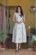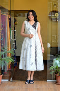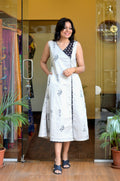 This sleeveless overlap-style dress features a clean, contemporary silhouette with a thoughtful blend of craftsmanship and contrast. The front overlap panel is adorned with subtle, delicate embroidery on a light base, paired with a contrasting black Ajrakh fabric panel showcasing classic geometric motifs. The overlap is secured with a discreet hook-and-eye opening for a neat finish. The front panel edge is highlighted with hand-embroidered buttonhole stitch detailing, adding a refined artisanal touch. A functional side pocket is seamlessly added, enhancing everyday comfort, while a short sleeve is attached underneath the dress, maintaining the elegant, handcrafted look.