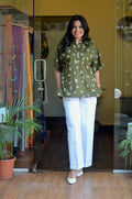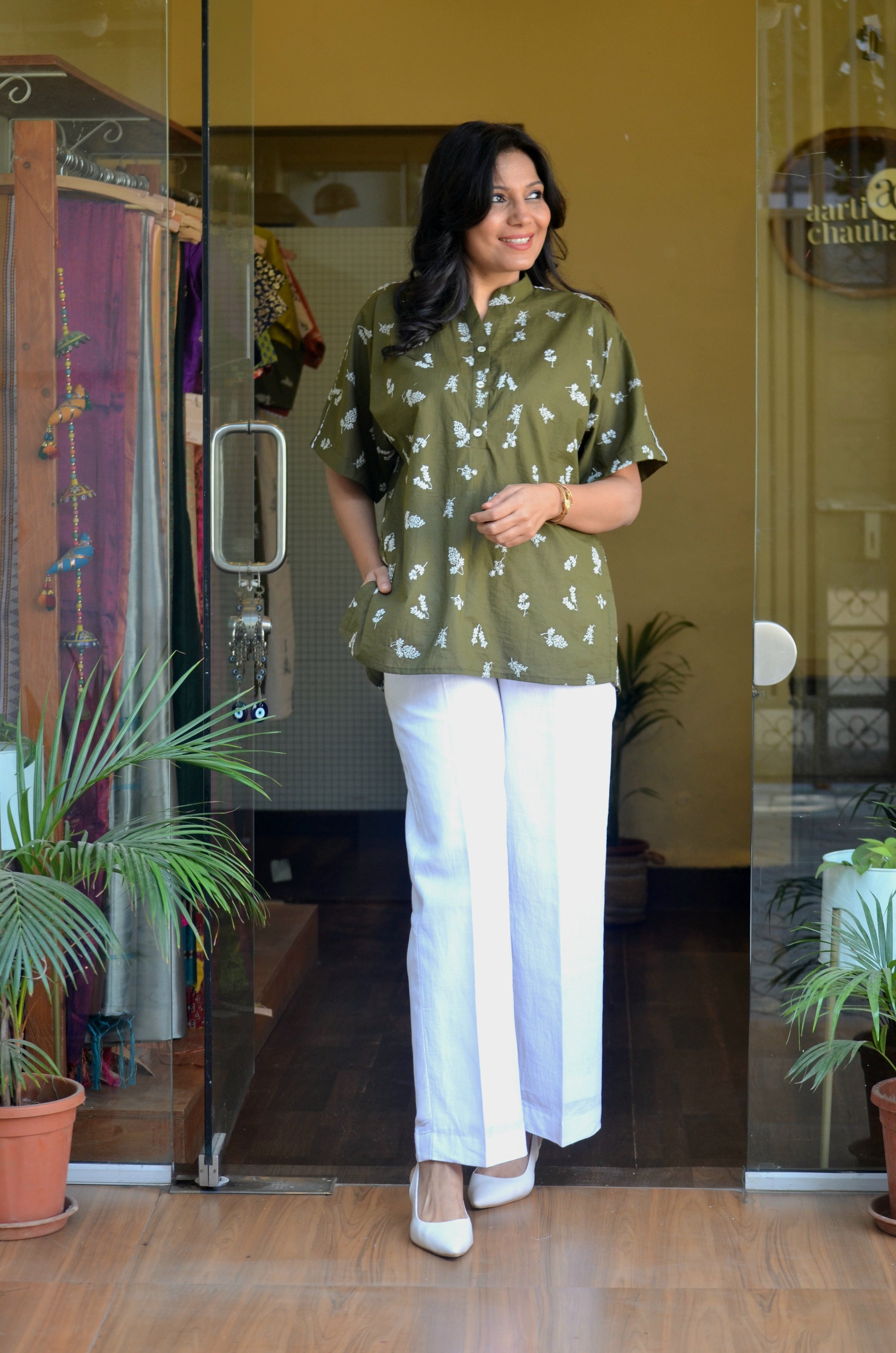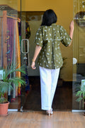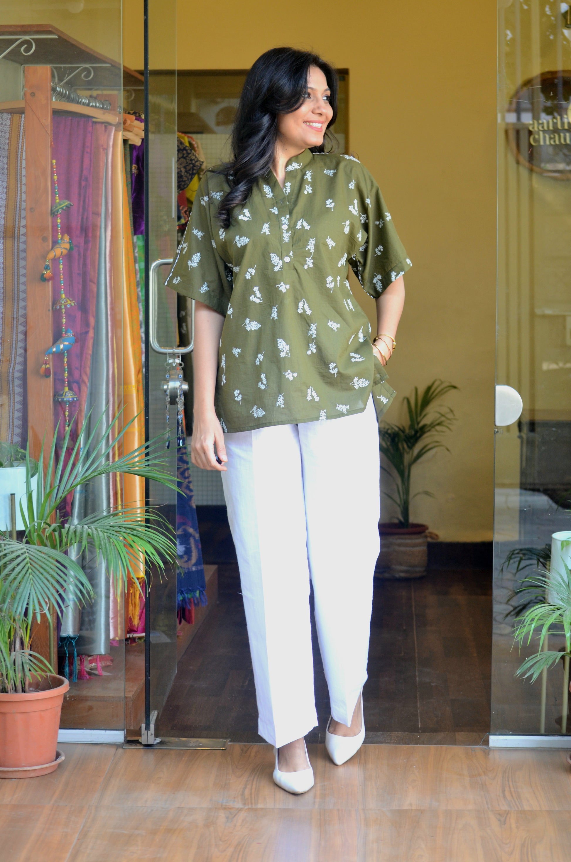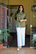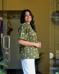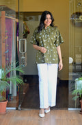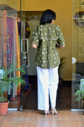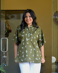 This olive green anti-fit short kurti is crafted in soft cotton fabric, highlighted with delicate all-over white floral embroidery that gives it a fresh, handcrafted feel. The design features a neat Chinese collar with a subtle shell button opening at the front, adding a refined touch to the relaxed silhouette. A fine white lace detail runs along the shoulders, softly accentuating the structure, while the back yoke is elegantly divided with matching white lace for added visual interest. Easy, airy, and thoughtfully detailed, this kurti blends comfort with understated elegance, making it ideal for effortless everyday wear.